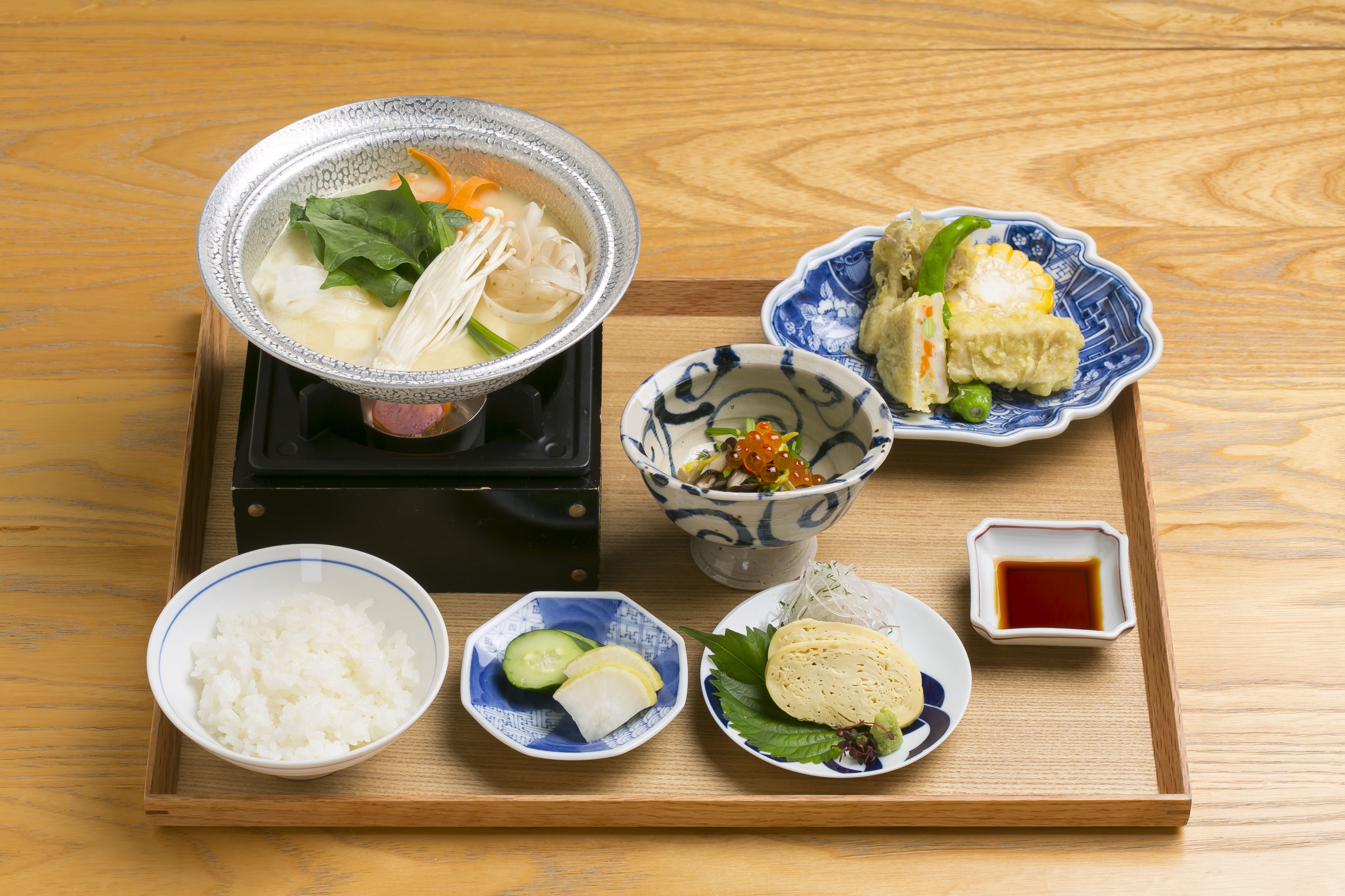 京都老舗豆腐屋「平野屋」の豆腐を使用した白味噌仕立ての湯豆腐。白味噌には創業天明元年「石野味噌」を使用しました。京都らしい白味噌と出汁を合わせた、優しい仕上がり。刺身で食べる刺身湯葉や揚げ物もご一緒にお楽しみください。