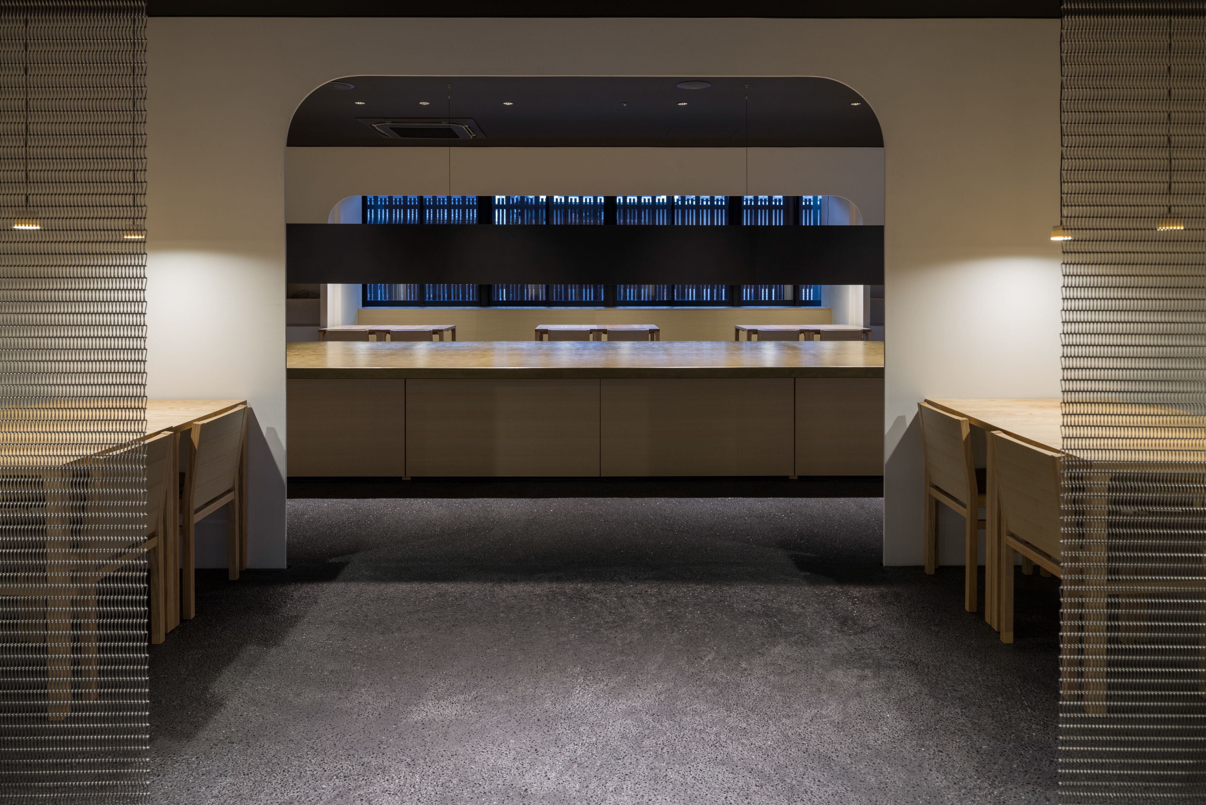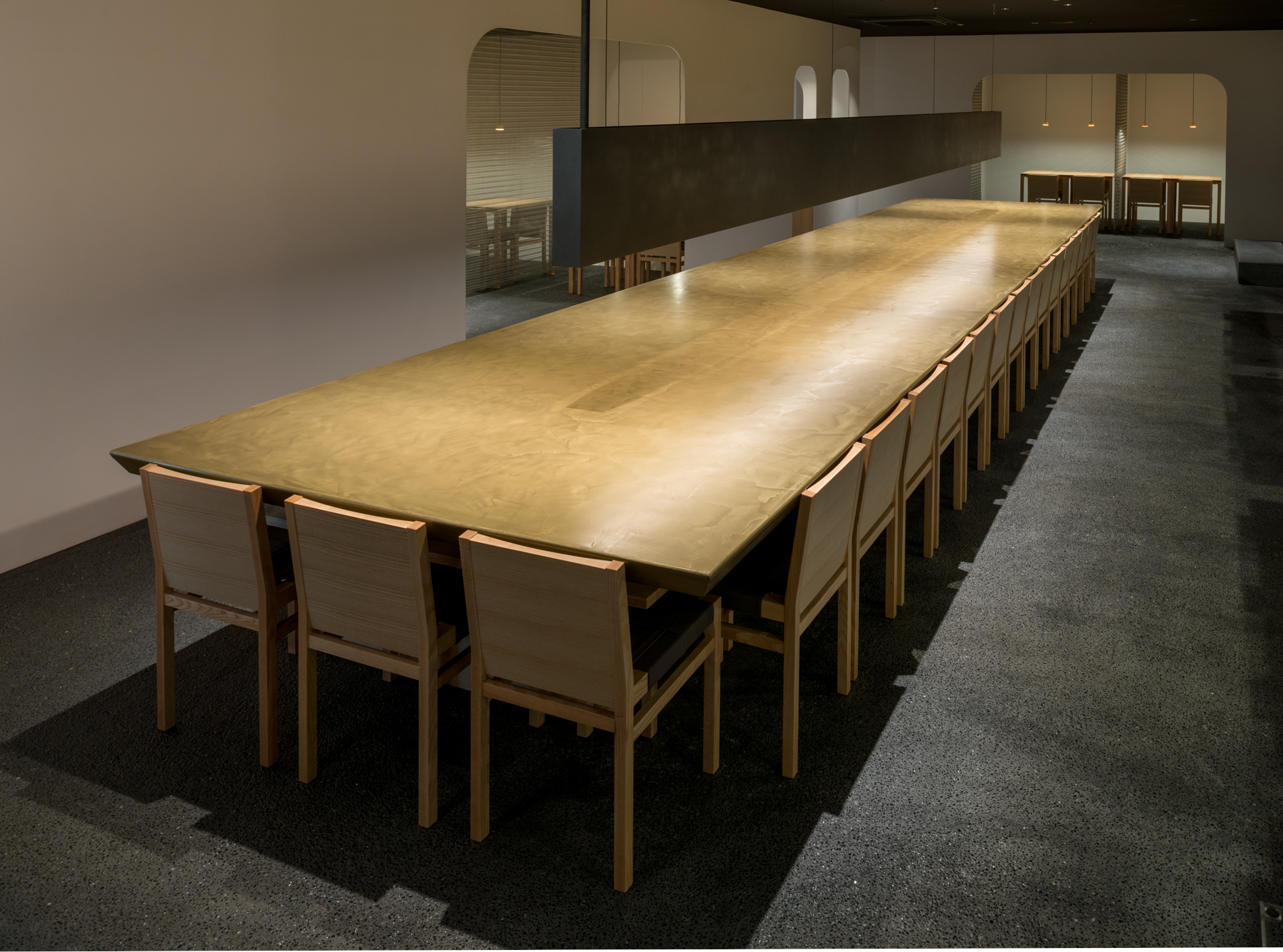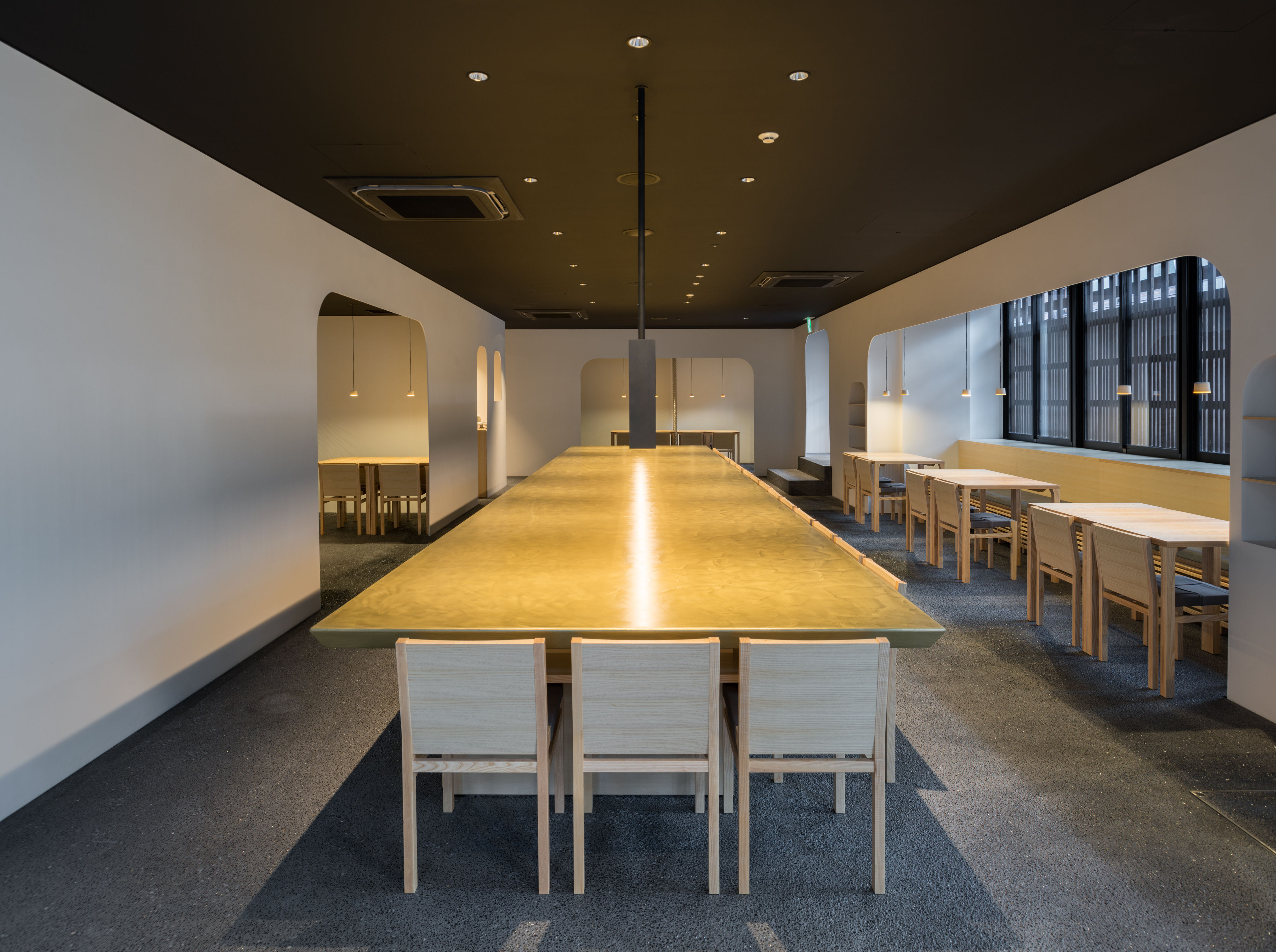 暖簾をくぐると建築家、永山祐子が手がけた和モダンの世界が広がります。薄い漆喰の白い壁、ろうそくのような幻想的な光を放つ真鍮のロングテーブル、既存の蔵を生かした離れの静寂な空間、四季折々豊かな表情を見せる庭など見所が満載です。