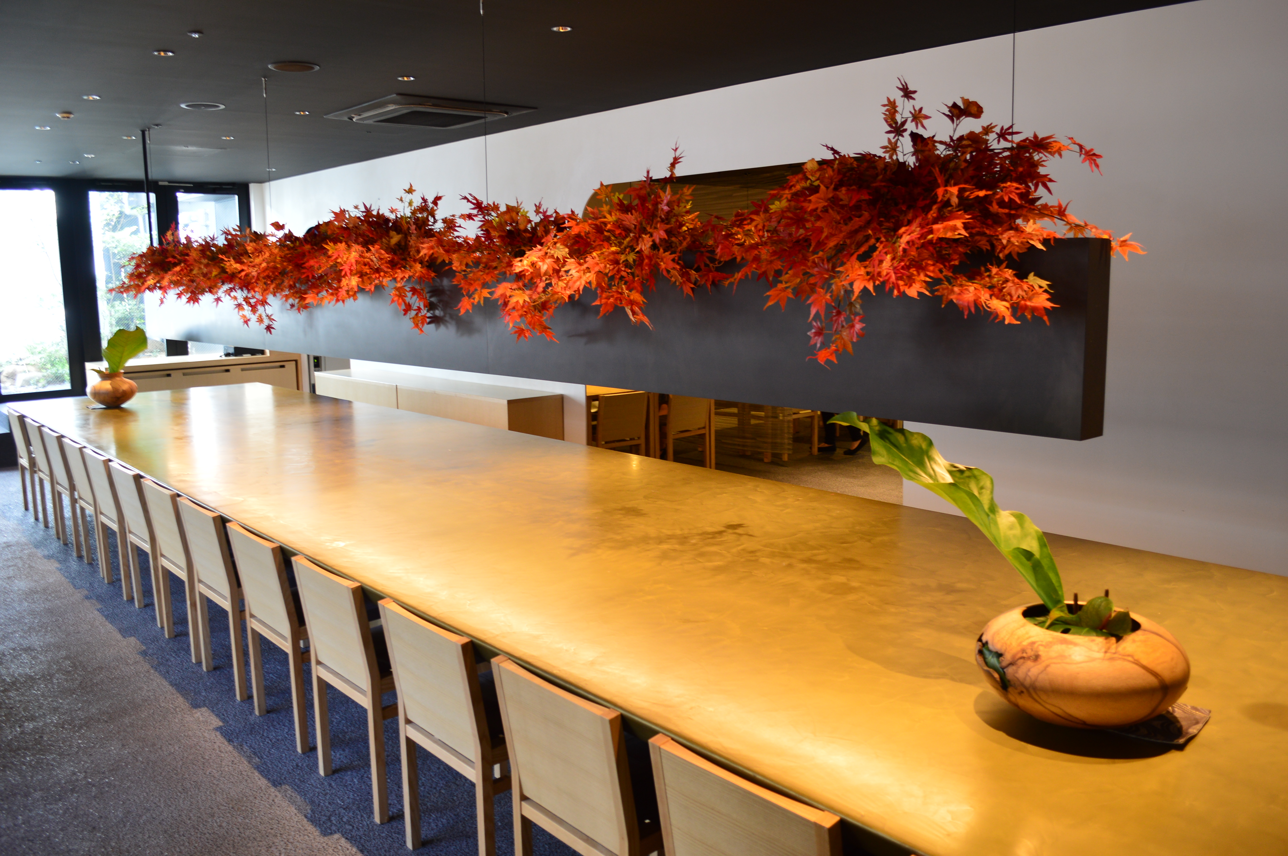 また、昨年大好評であった店内の紅葉装花が今年も復活!5mのロングテーブル上に、一部本物も使用した60本以上の紅葉で店内を彩ります。段々と秋めく京の街並みよりひと足先に、「居様/IZAMA」で秋をお楽しみください。