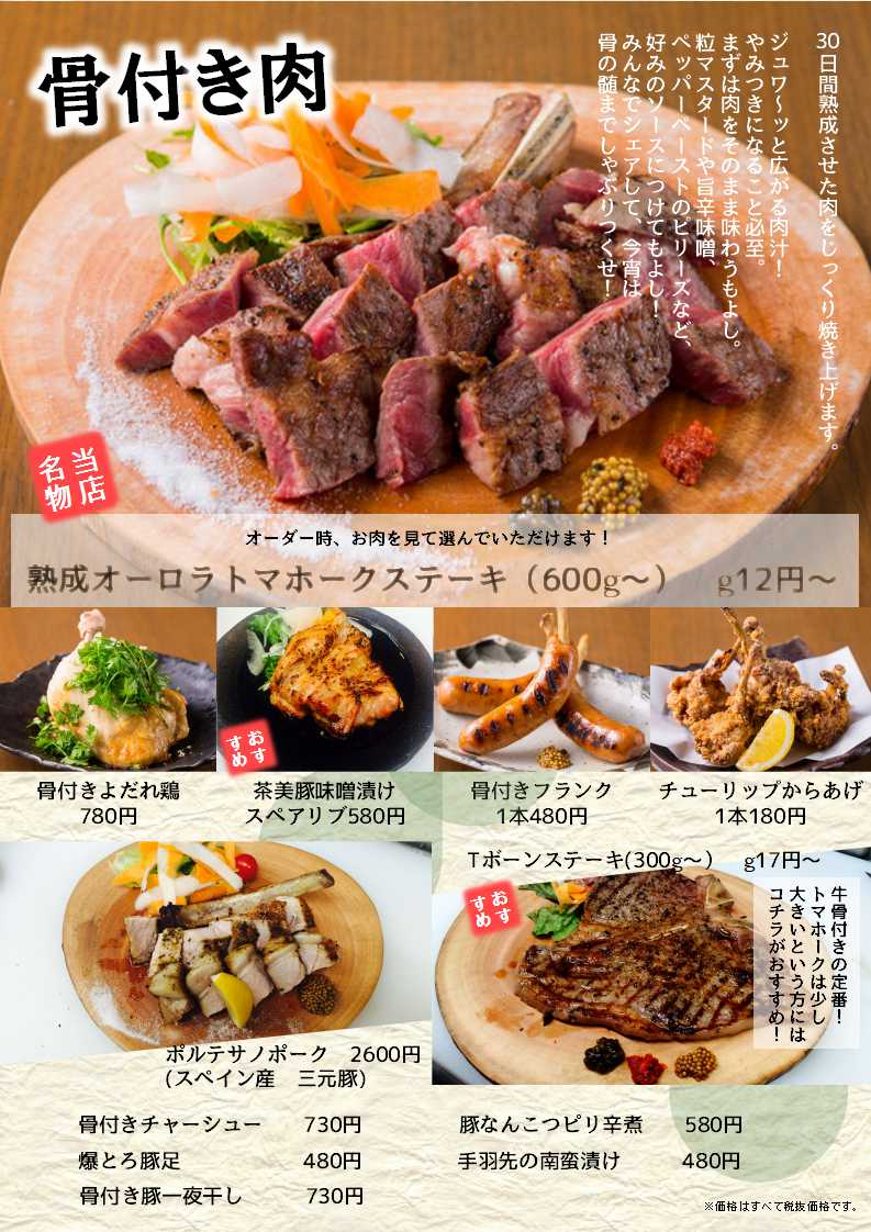 「骨の髄までしゃぶりつくせ!!」をテーマに、ネイティブアメリカンの斧「トマホーク」から連想させる見た目で名付けられた「トマホークステーキ」を目玉に牛・豚・鶏の「骨付き肉」をメインに、関西ではまだまだ馴染の薄い、肉や馬のホルモンなどの希少部位なども楽しめるお店です。