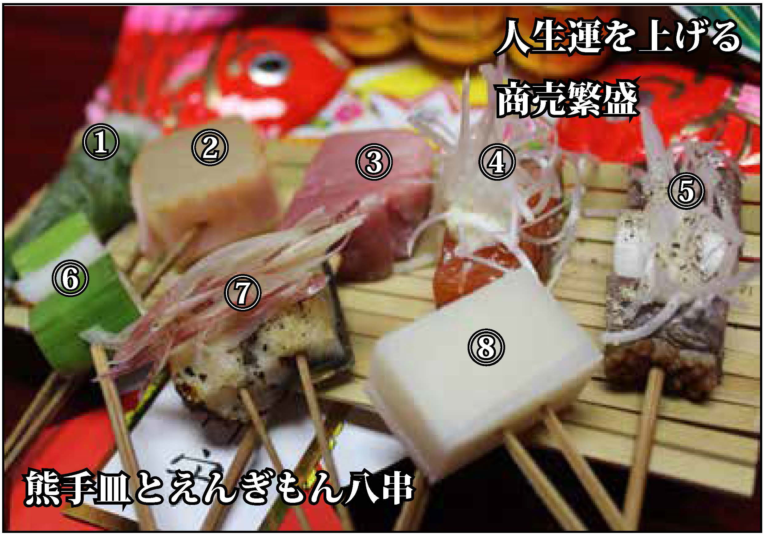 ⇒④人生運をあげる…一つ一つ縁起を担いだ『えんぎもん八串』が数多くの人生運を上げてくれます。