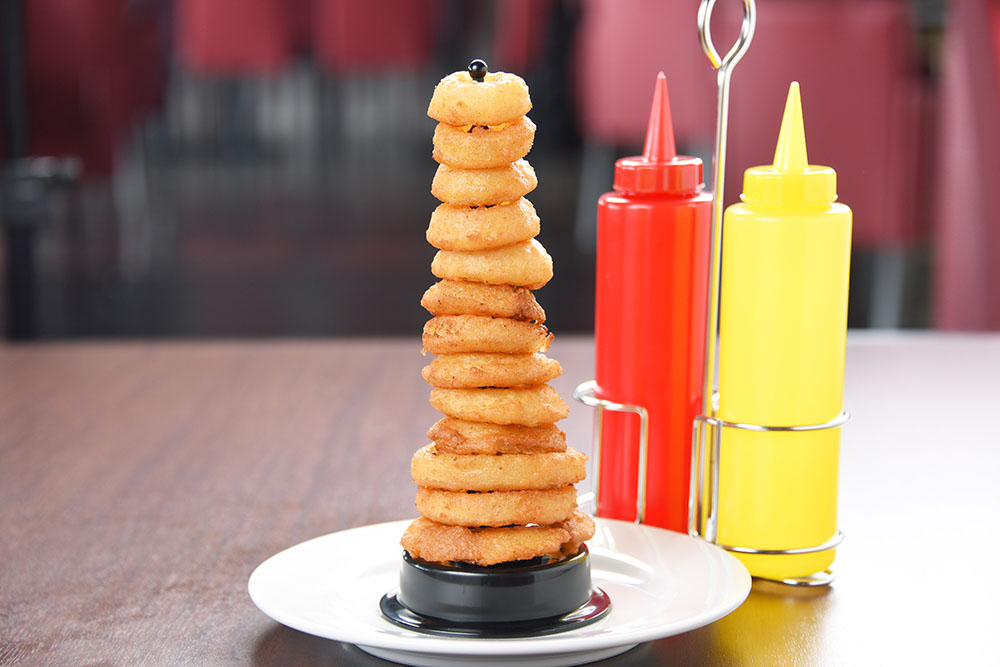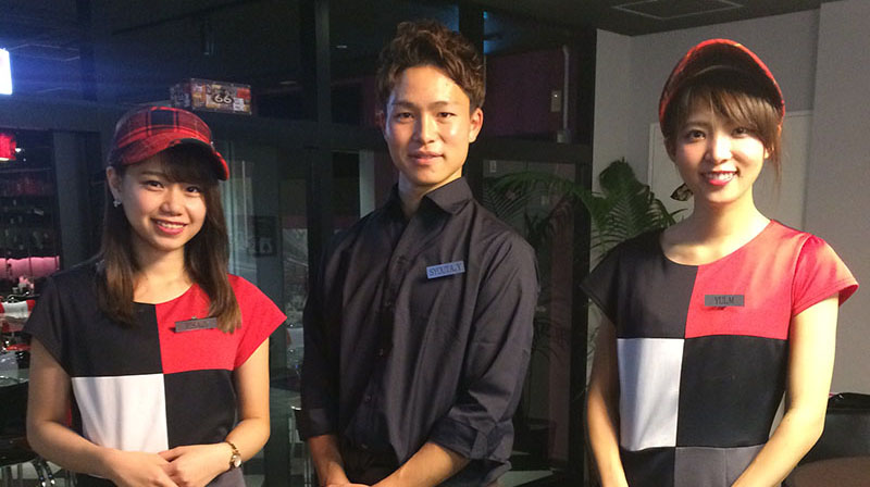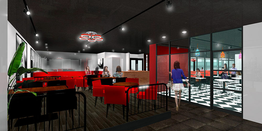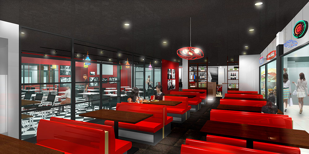 赤と黒を基調にしたスタイリッシュな店内とオリジナルコスチュームのスタッフが印象的な、本格アメリカンダイナー。