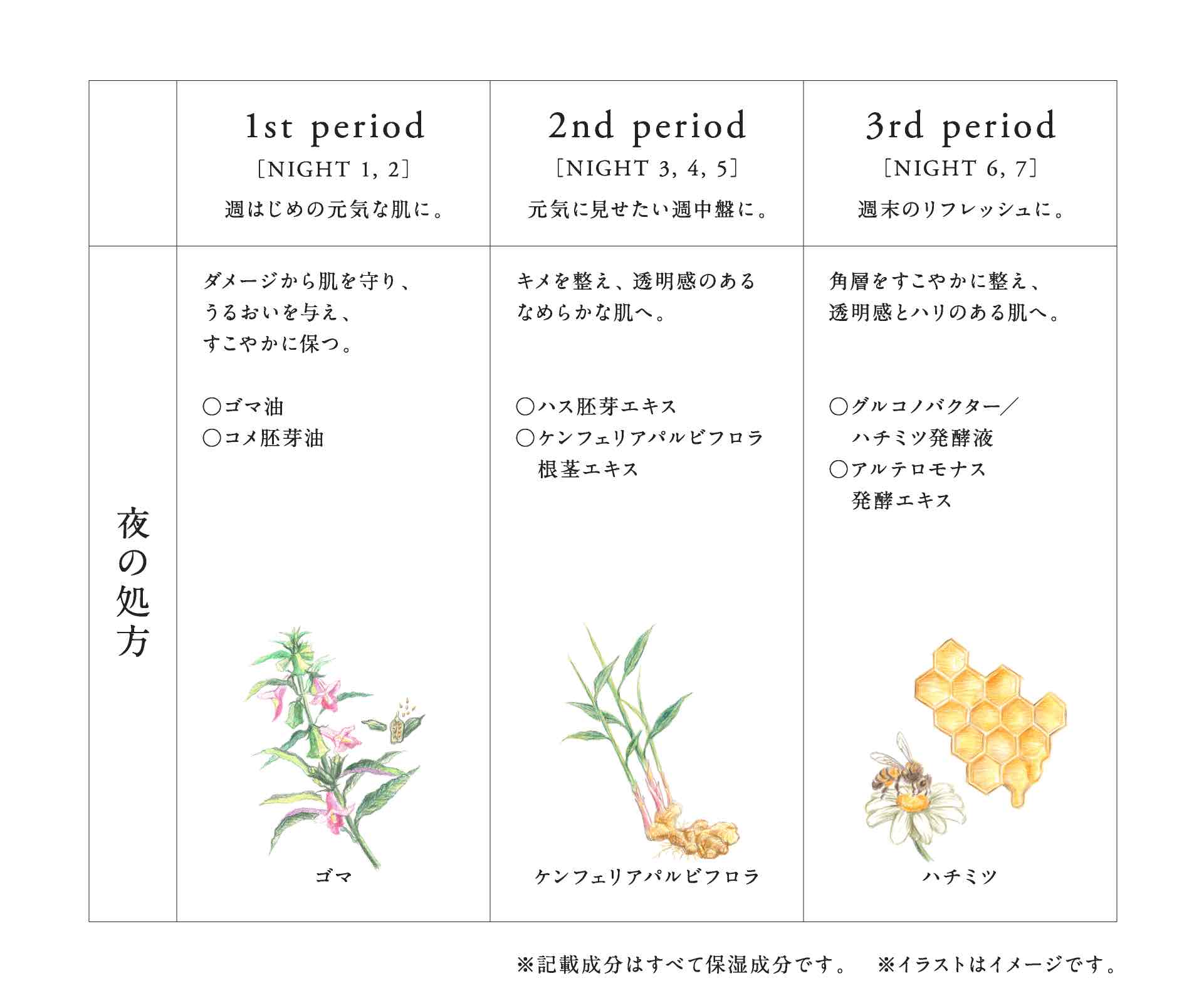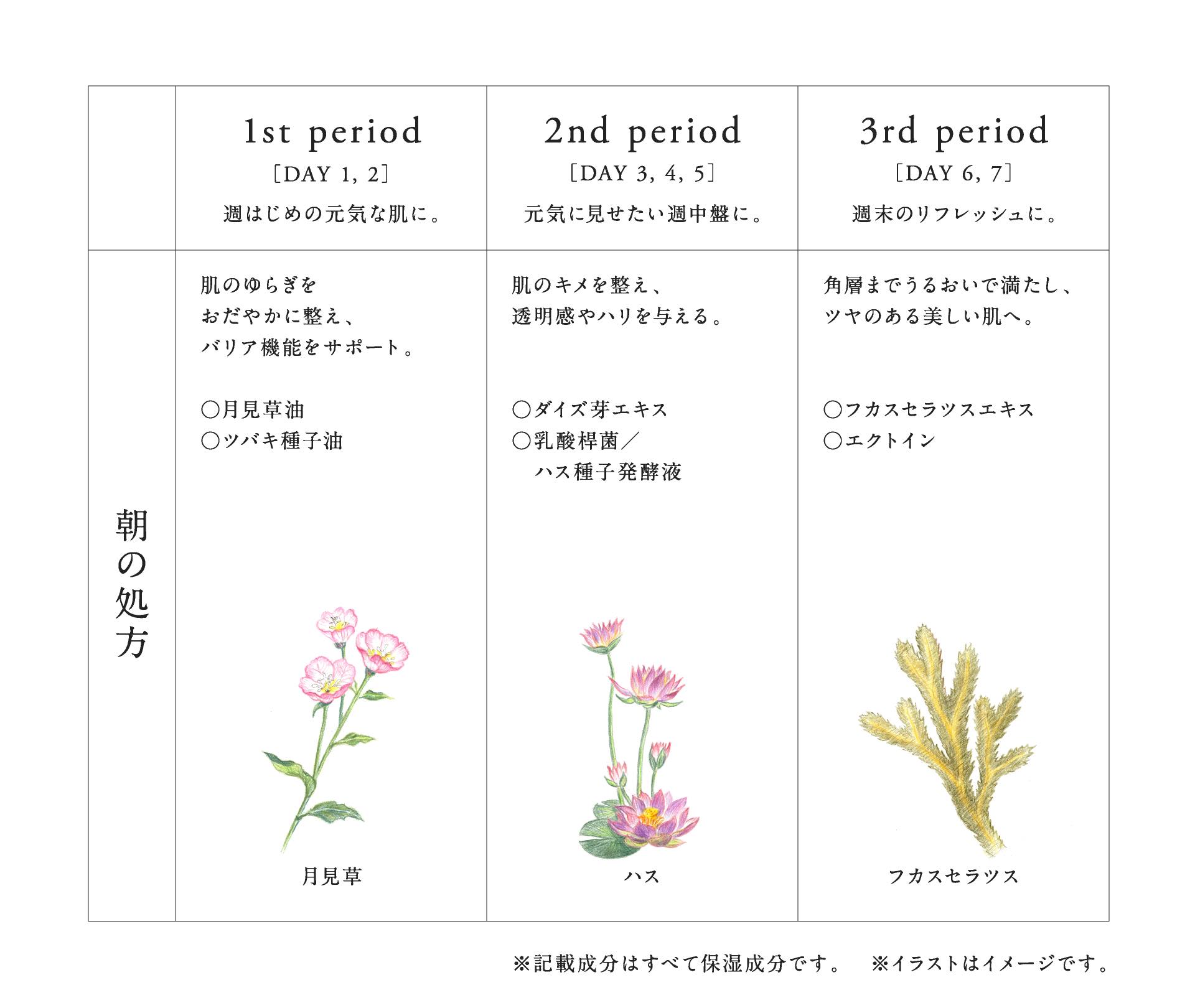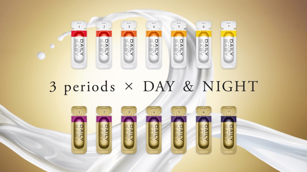 また、朝と夜でも肌に必要な成分は違っています。朝は「肌をより元気に見せる」、夜は「肌の状態を回復させる」ことが大切です。それを週初めの元気な肌、週半ばの疲れて見える肌、週末の休日の肌ごとに必要な成分を変えたスキンケアが「DAILY BABY」です。
