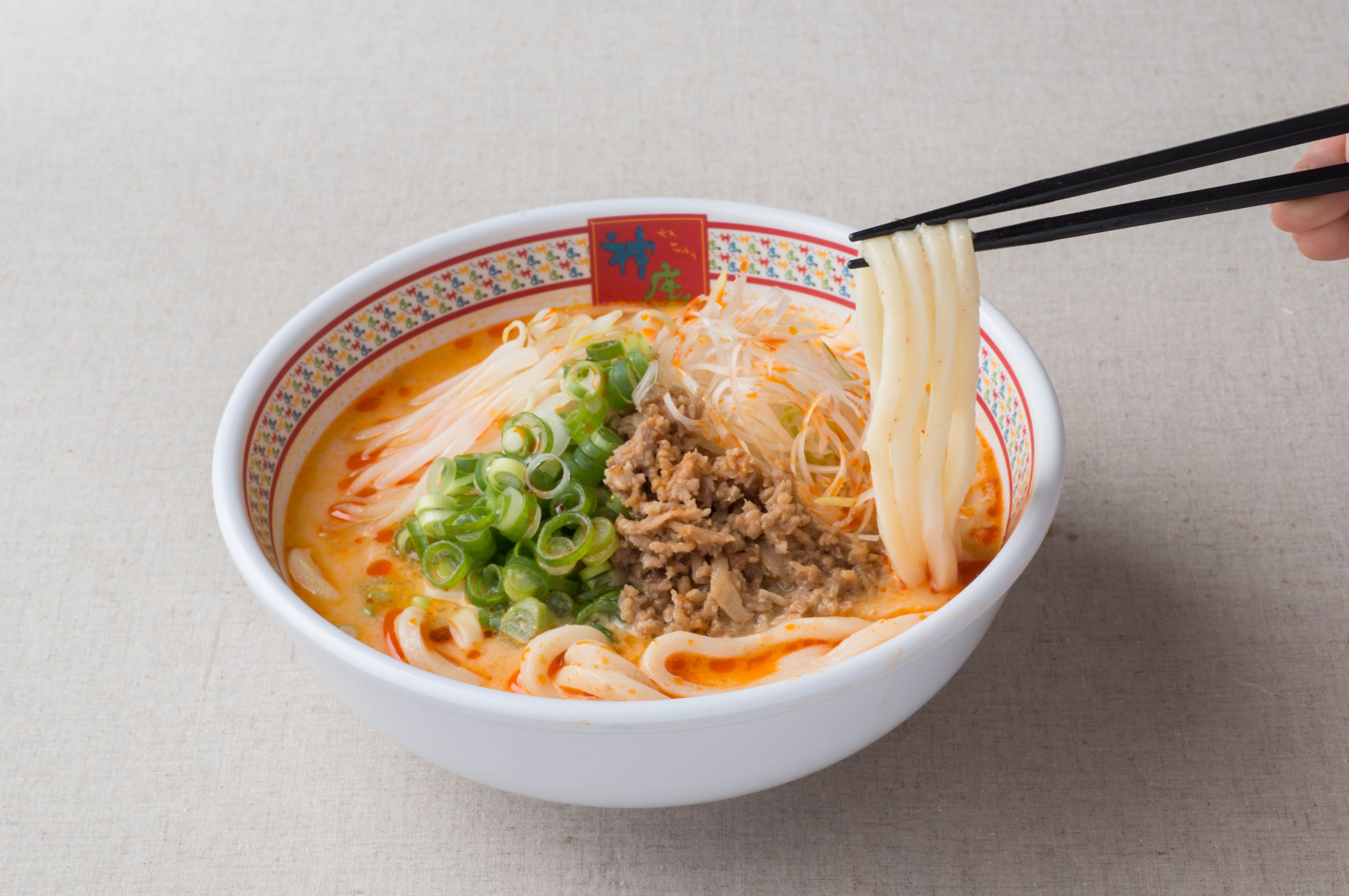 麺は、ラーメン専門店「どうとんぼり神座」にとって、最初で最後の試みとなる「うどん」を使用します。国産小麦粉100%のうどんは、のどごしがよく、なめらかです。薬味の青ネギと白ネギは、それぞれ異なる歯ごたえと旨味があり、このメニューの絶妙なアクセントになっています。