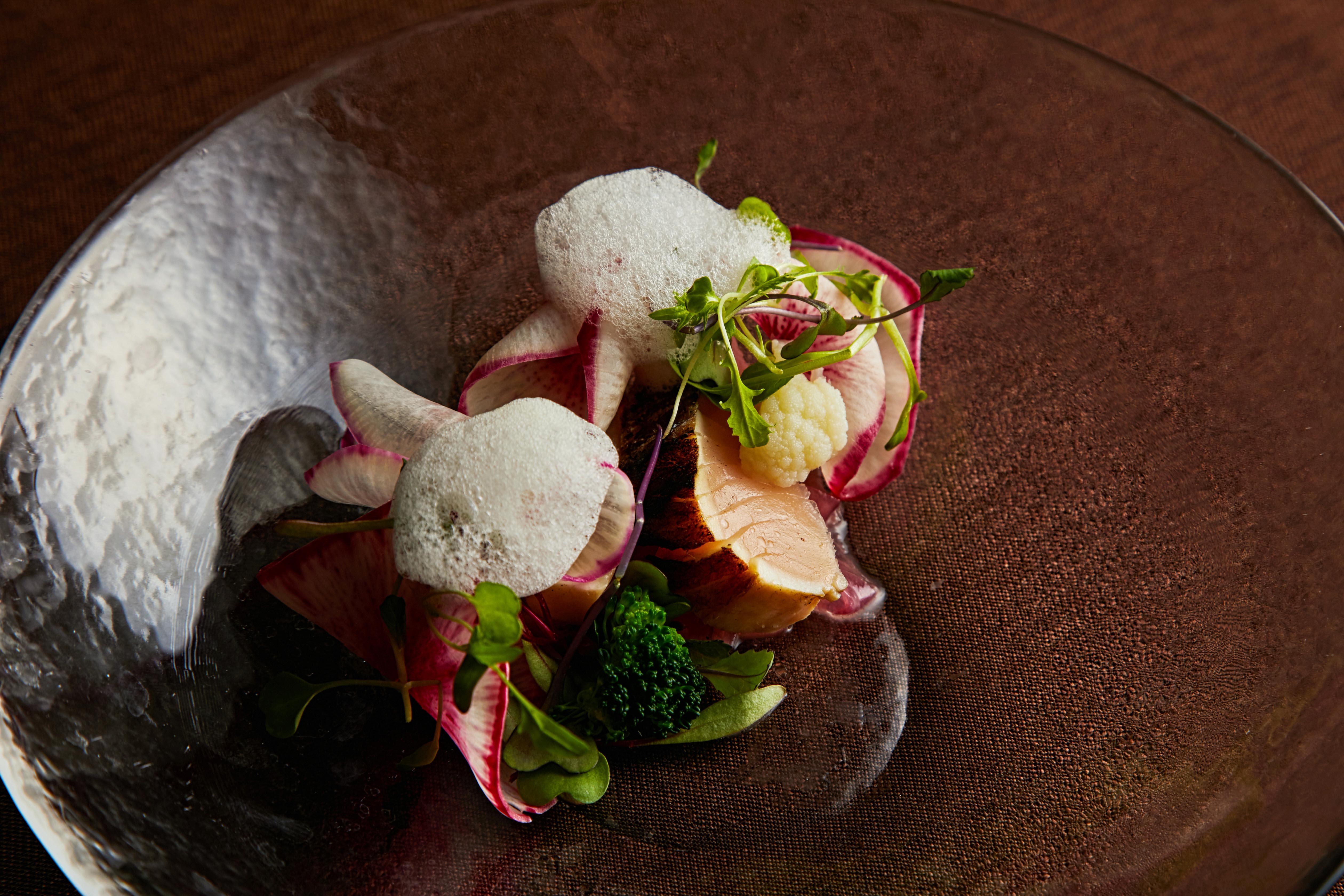 三重県鳥羽より直送された旬の鮮魚を表面のみ薪火で香り良く炙ります。香ばしく焼けた皮面と炙ったままのほんのり温かい温度でとろけるような食感に。サラダ仕立てでお楽しみいただけます。