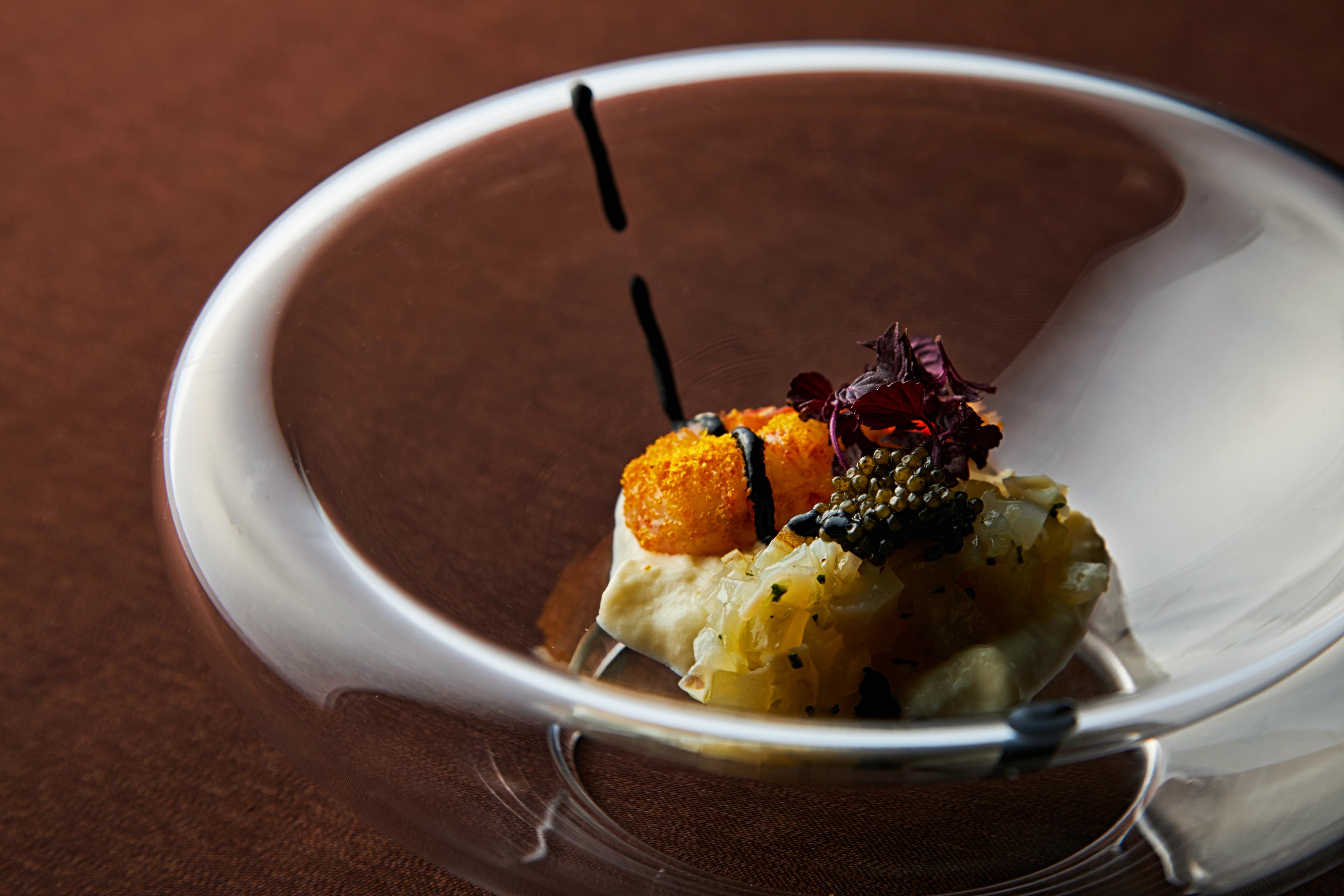 ひよこ豆のクリーミーなスプーマとキャビアの塩気、墨の煮詰めたソースがアクセント。