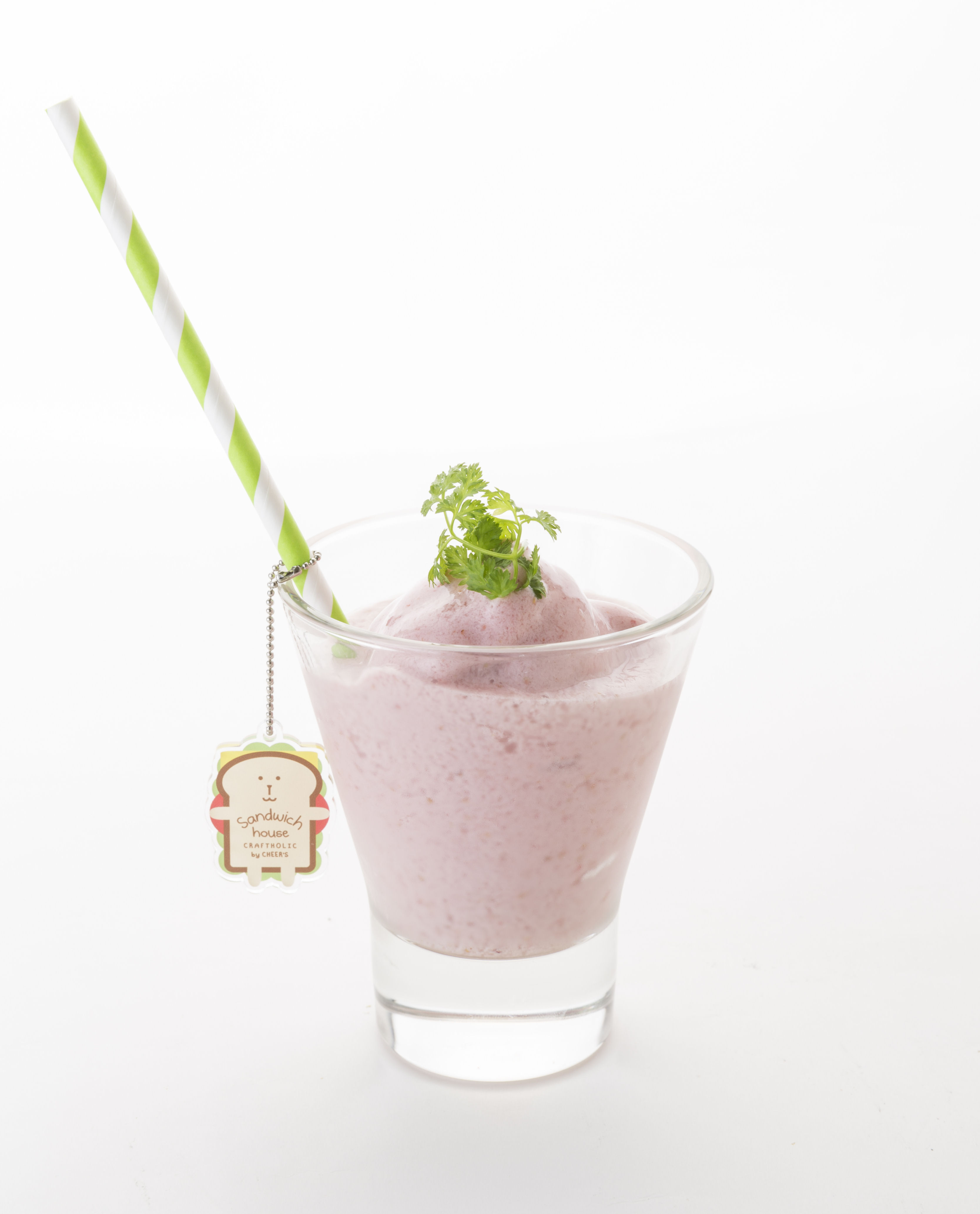 ウサギ型宇宙人『RAB(ラブ)』とサル型宇宙人『LORIS(ロリス)』がサンドイッチモチーフになったオリジナルキーホルダー付きのスムージー。
