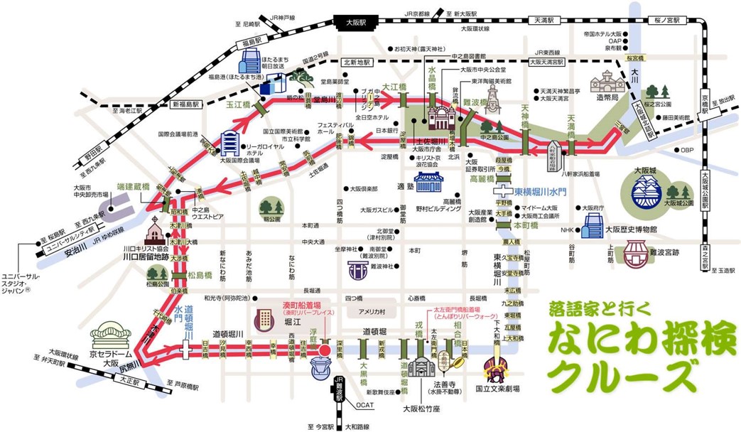 内容:最新鋭の旅客船に乗り、落語家ガイドの楽しい案内で、水都・大阪のオフィス街を通り、大阪市中央公会堂、大阪城などを川から遊覧します