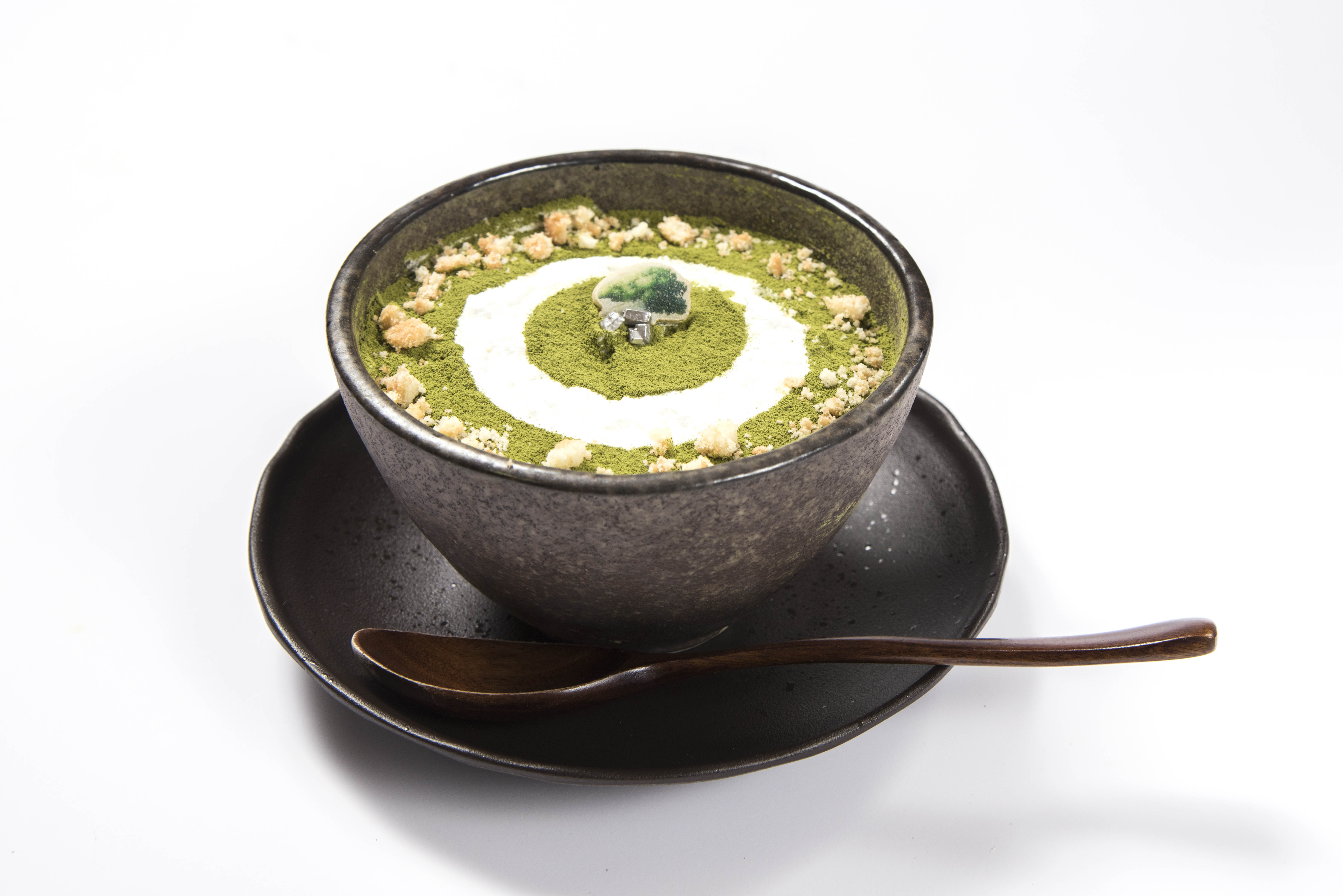 ご神体が祀られた山頂を和風の抹茶パフェで表現。中心には大木と巨石のご神体。