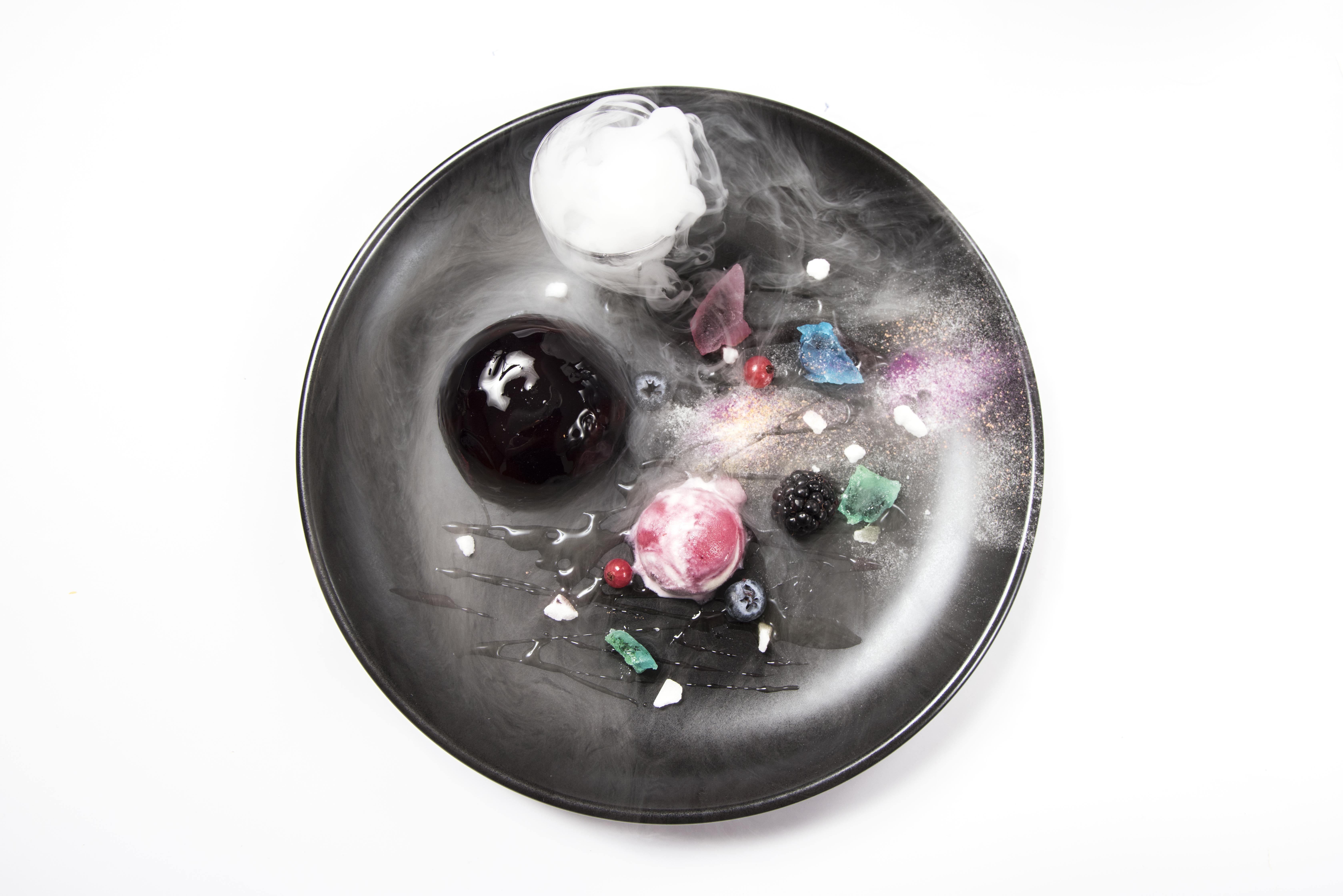 瀧と三葉2人がそれぞれ見上げたあの彗星をデザートプレートで再現。ムースで出来た大きな彗星、割れて分離した彗星はアイスで。雲を抜けていくイメージをドライアイスで表現しています。
