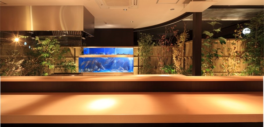 生け簀、32棟の農園ハウス施設を保有し、豊富な種類の農産、水産食材を鮮度抜群の状態でご提供。有名高級旅館やホテルで料理長を歴任した総料理長を中心に、新進気鋭の若い料理人メンバーが、自然豊かな丹後でとれる絶品食材の魅力を、様々なジャンルの調理方法で最大限に引き出します。光と水の動きが美しい屏風石を眺めながら、瑞々しい午餐をゆったりとしたカウンターで楽しんでいただけます。