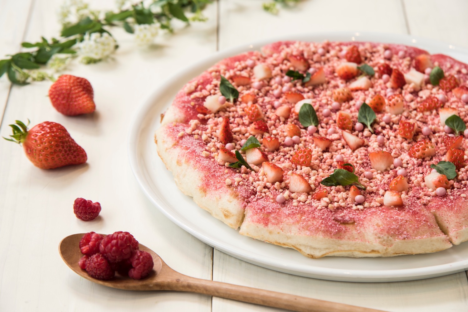 ピザ生地にラズベリーパウダーを合わせたホワイトチョコレートチャンク、ラズベリーシュガー、ストロベリーやワッフルボールをトッピングした春らしいピンク色のチョコレートピザ。ベリーの酸味とホワイトチョコレートの相性は抜群です。