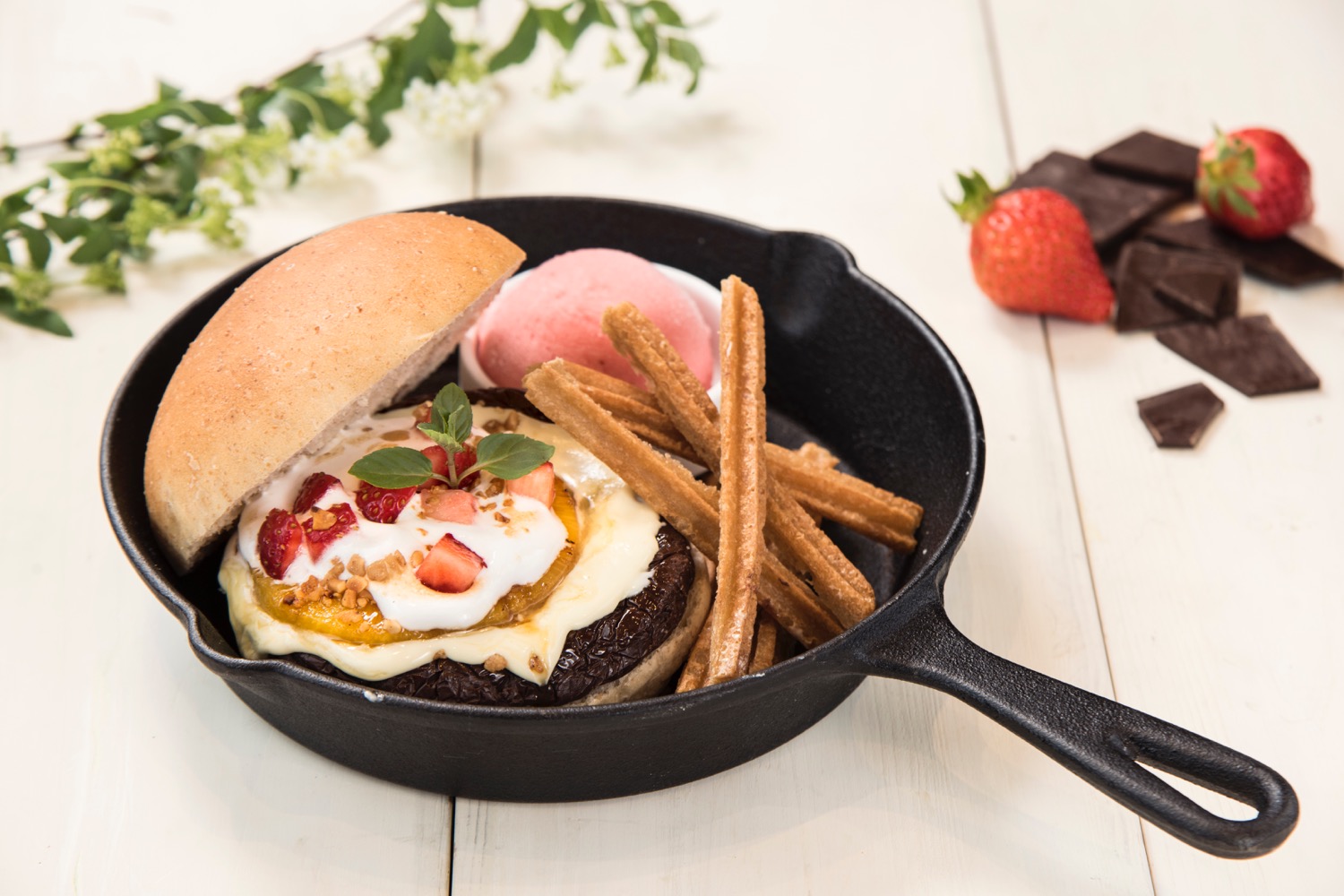 グラハムバンズに特製のチョコレートパテとキャラメリゼしたパイン、ストロベリー、マシュマロクリームとサクサクのヘーゼルナッツビッツを一緒にサンドしたボリューム満点のデザートバーガー。