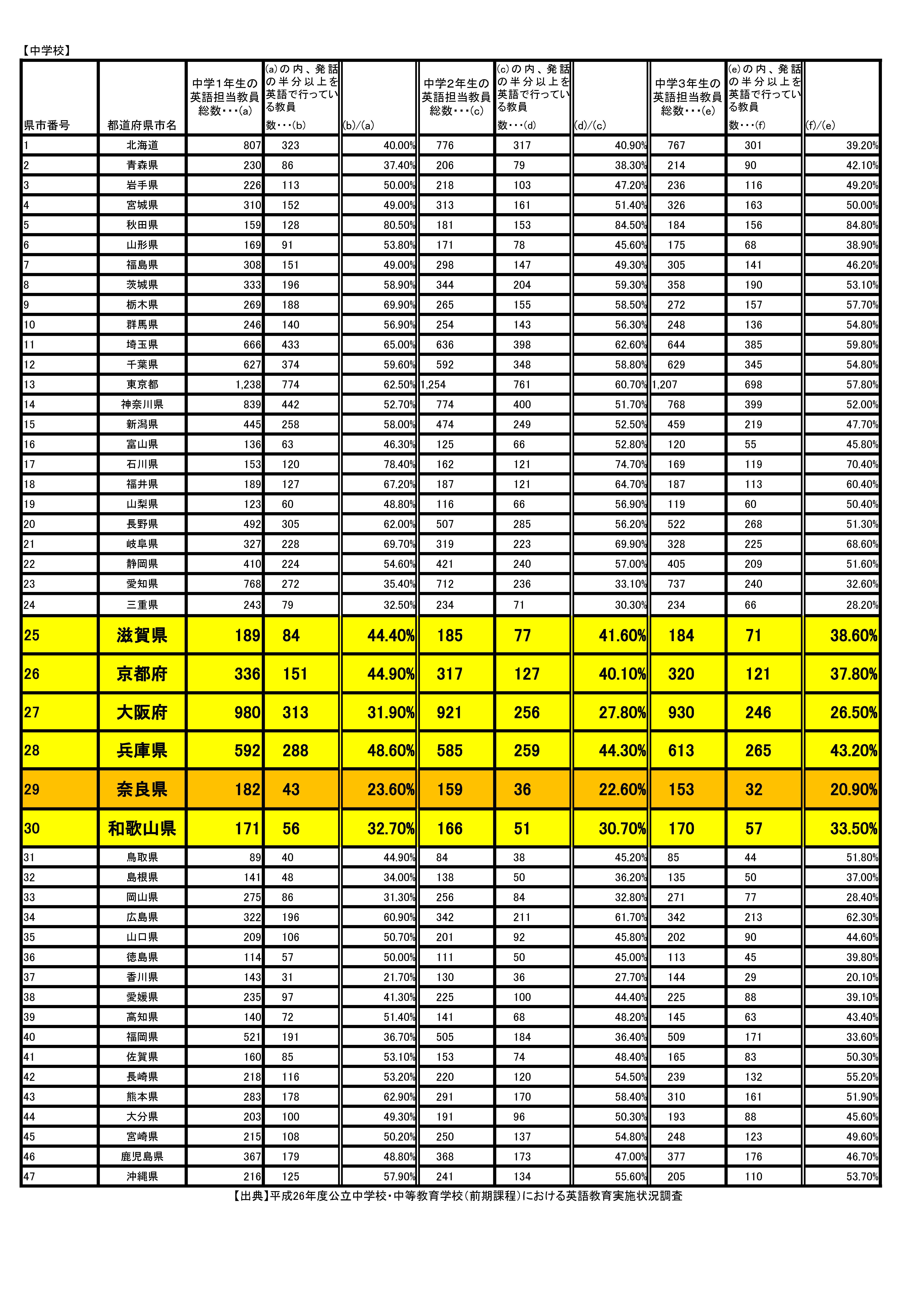 文部科学省が平成27年に発表した「公立中学校・中等教育学校(前期課程)における教育実施調査」の中で、奈良県は「授業における英語担当教員の英語使用状況」が22.8%と、最下位でした。同様に、関西の他府県も低水準でした。(添付資料参照)