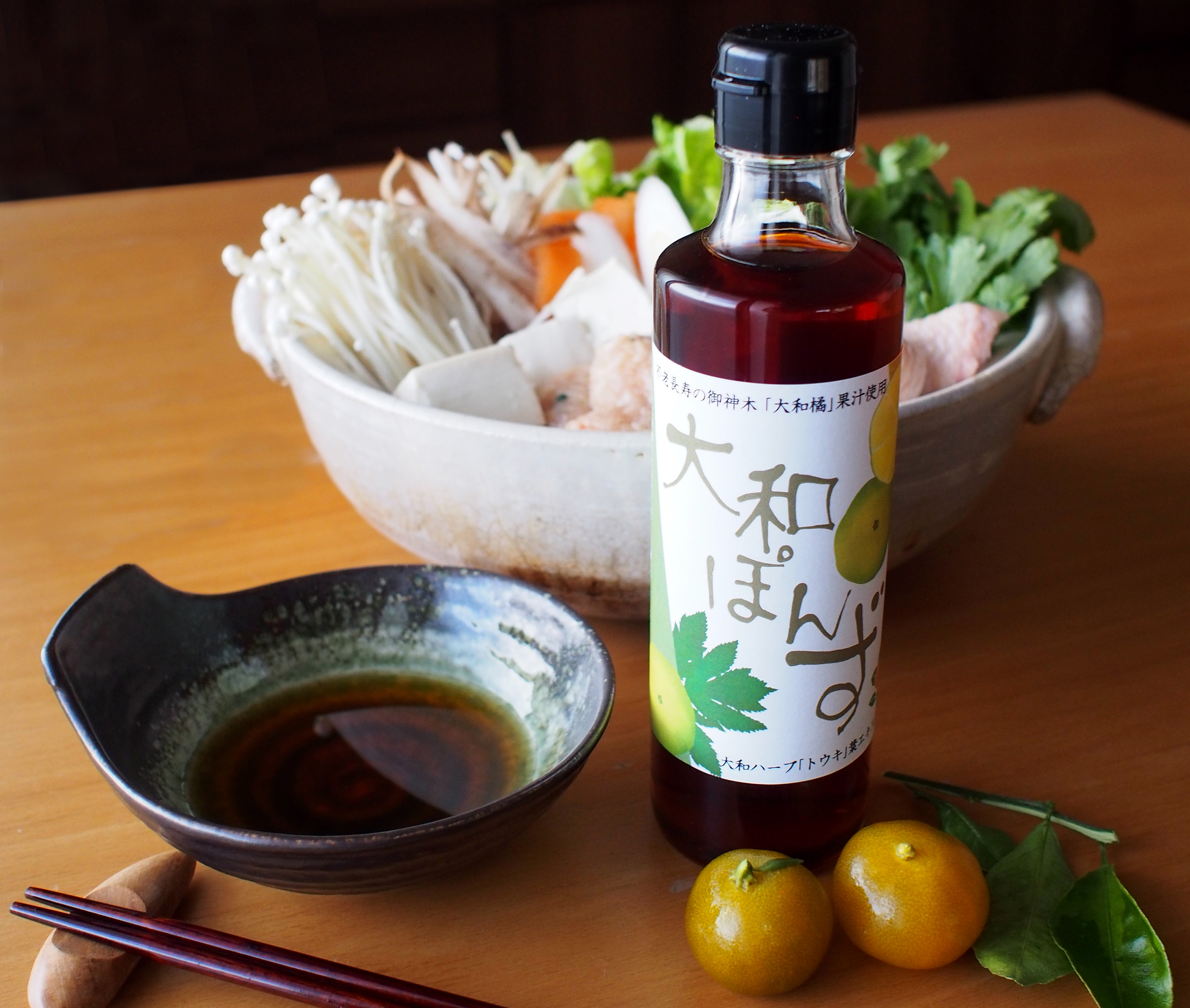 「大和ぽんず」では日本列島唯一の古来種と言われ、奈良橘プロジェクトにより近年奈良県で栽培が進められている「大和橘」の果汁を手絞り。奈良県の特産品でもある和ハーブ「大和トウキ」のエキスと共にポン酢にギュッと詰め込みました。香りと酸味、味わいにこだわり、完熟する前の青い「大和橘」を手摘み、手絞りしています。