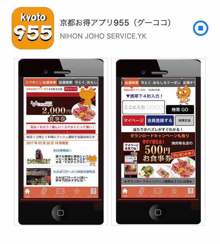 ●京都限定のアプリで、しかもプレオープンでありながら1週間で2000ダウンロード突破「京都お得アプリ955(グーココ)」