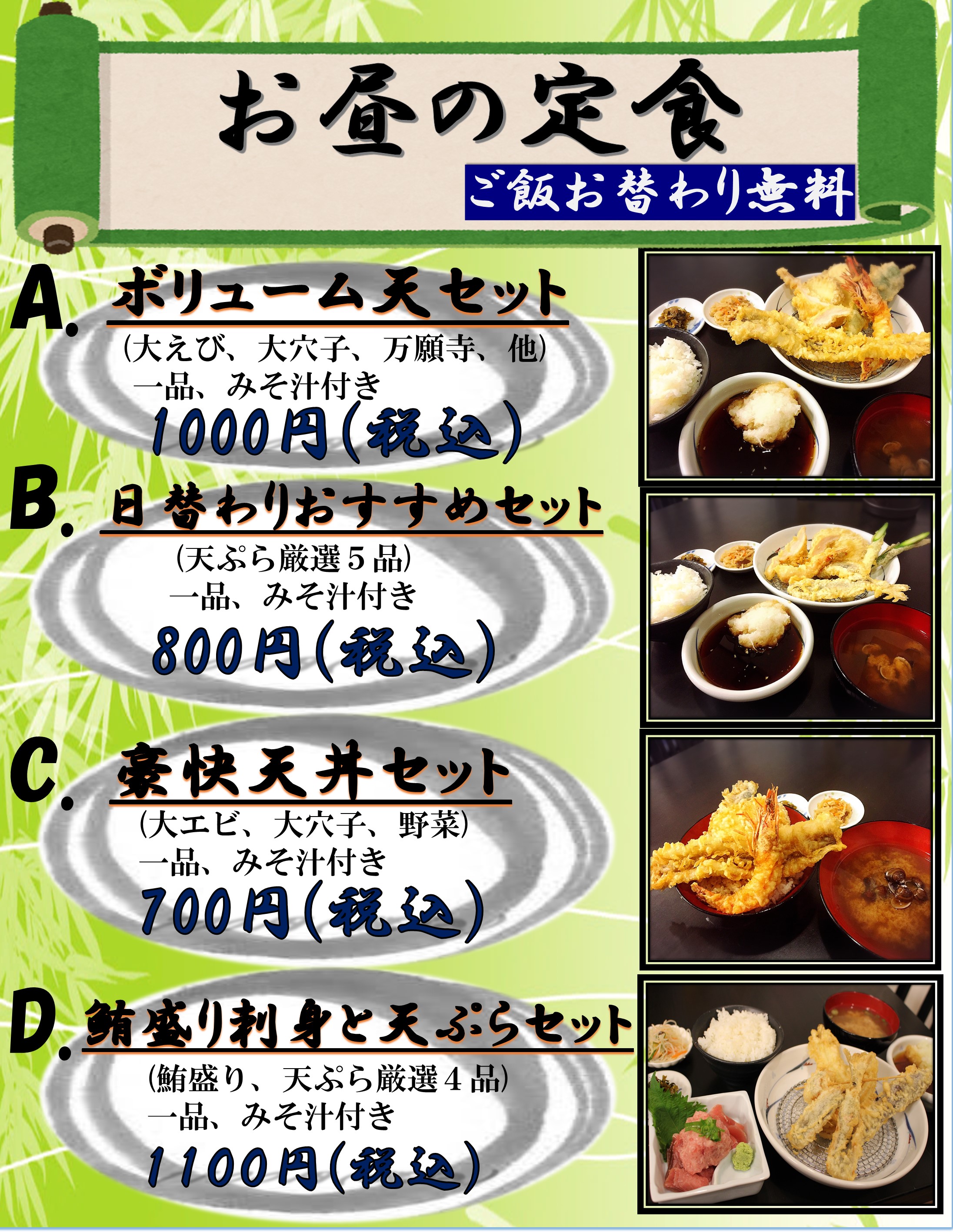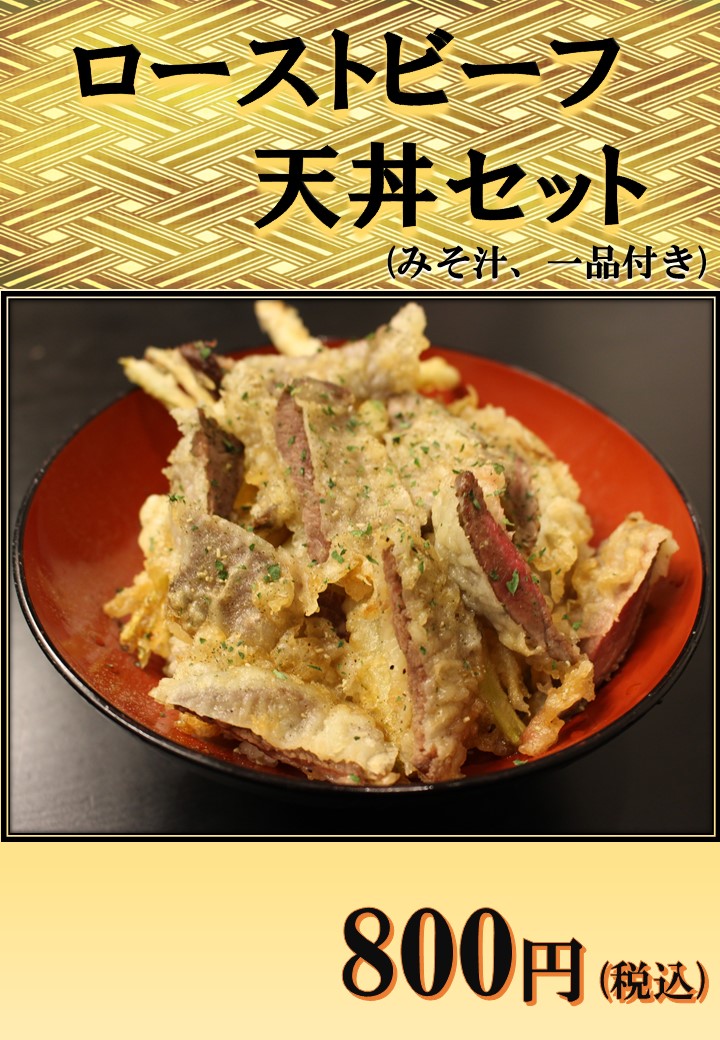 ローストビーフ天ぷらをご飯の上にのせ、ローストビーフ天丼としても出しております。ローストビーフ天ぷらのジューシーさと特製ダレが絡まって他店にはない創作天丼になっています。