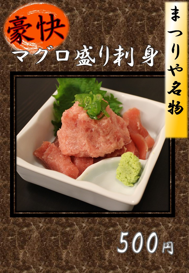 中でも、まつりや名物“豪快 マグロ盛り刺身”は、マグロの赤身切り身とトロたたきを豪快に盛った一品!