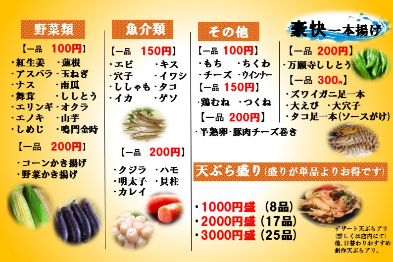 定番メニューの天ぷらから、店主がこだわり旬の食材をつかってお出しする創作天ぷらもあります。