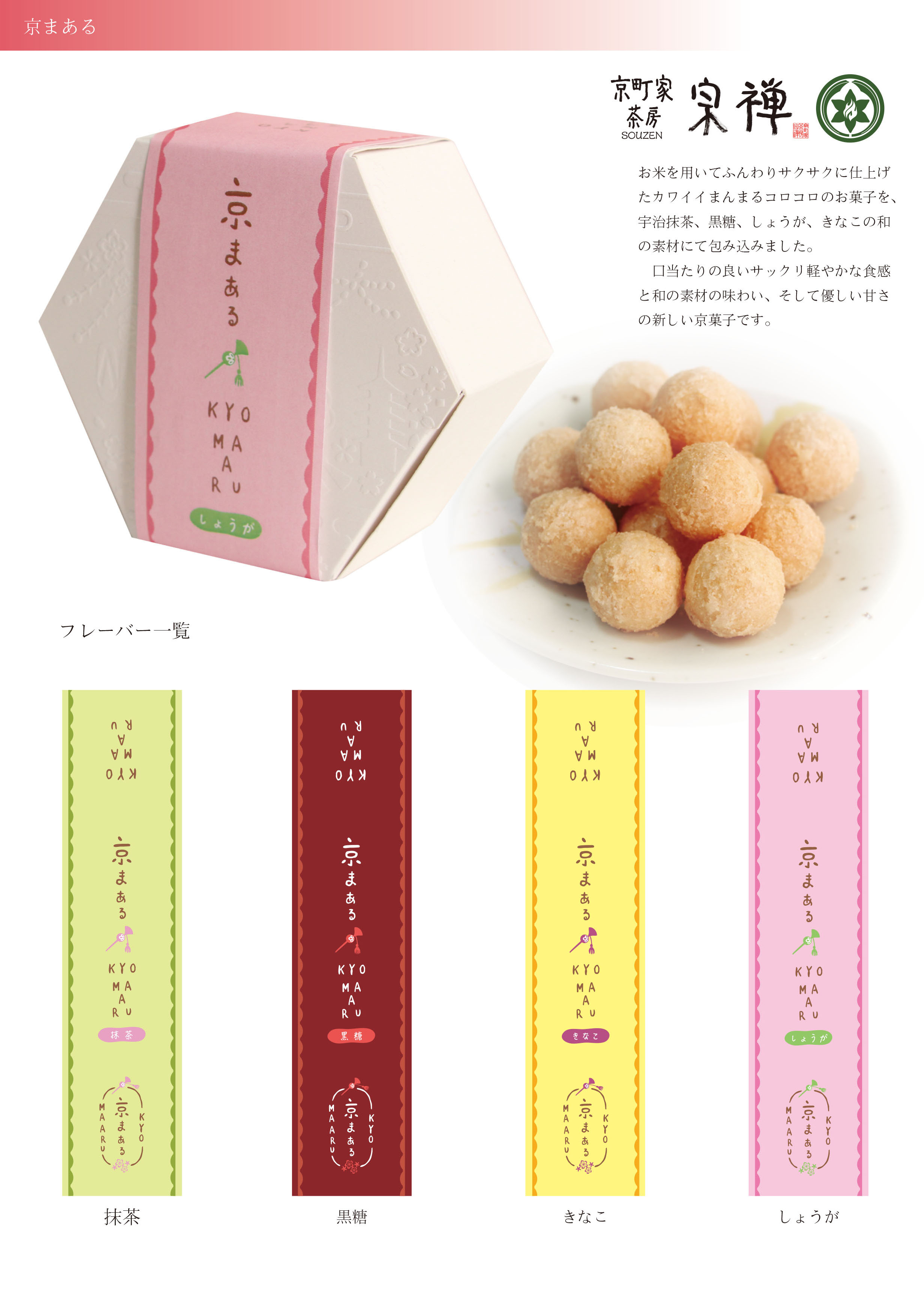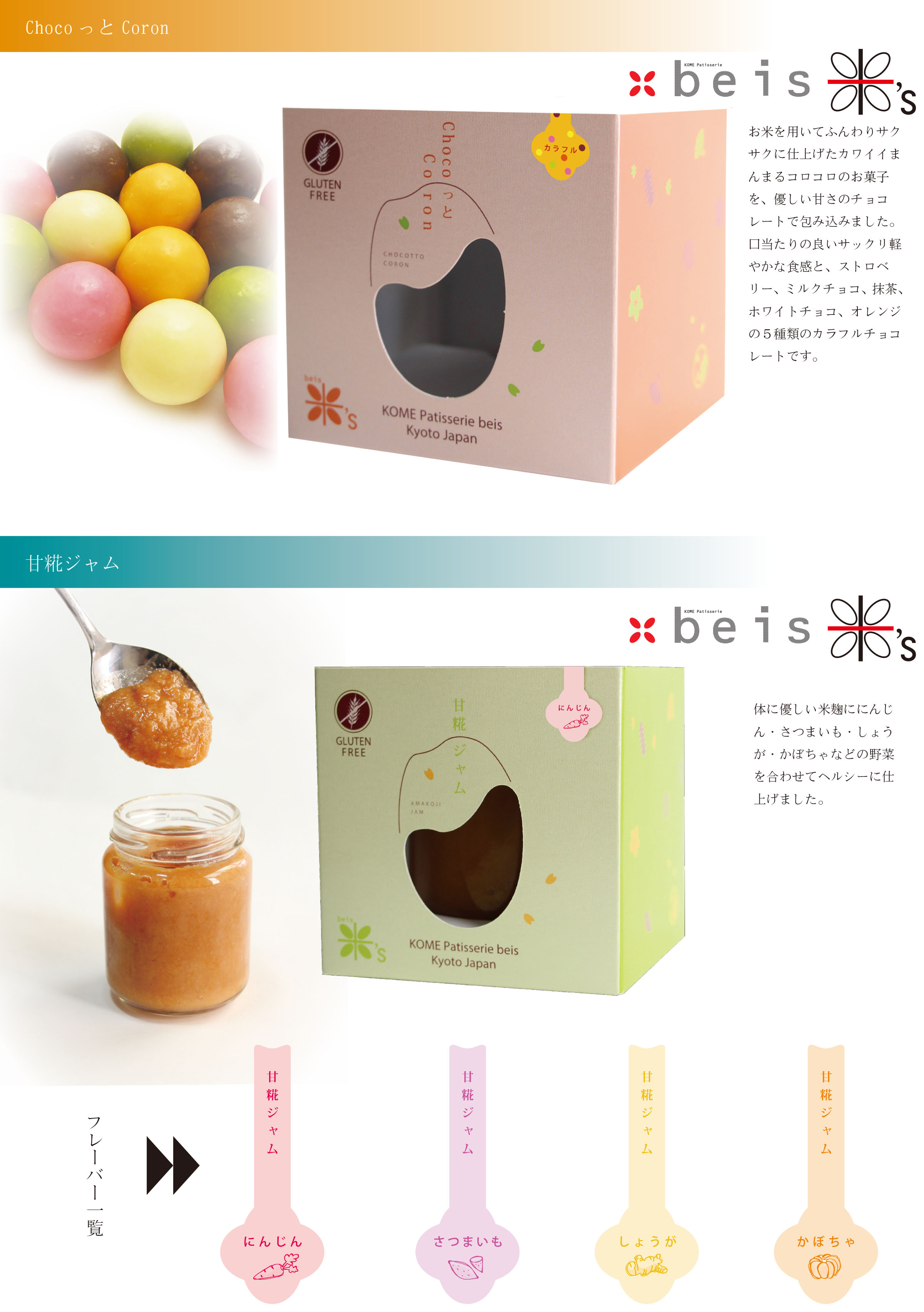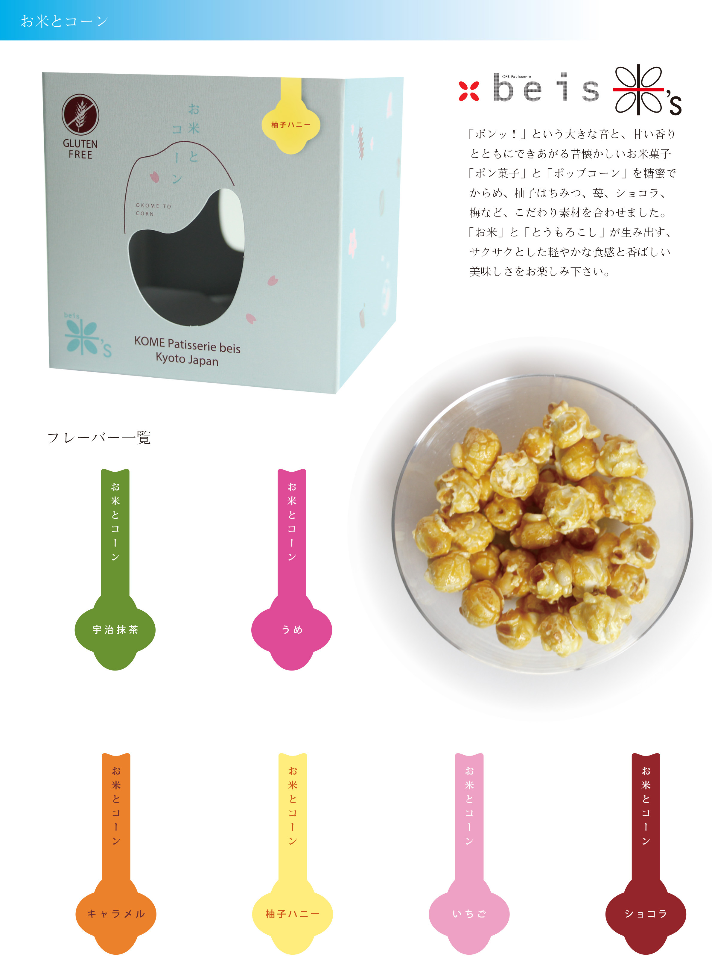「串わらび」は、クーベルチュールチョコ、京都水尾の柚子、宇治抹茶等を煉り込んだわらび餅を串にさしたカジュアルなわらび餅全11種。「京まある」は、サクサクとした食感のお米菓子に、しょうが、きな粉、抹茶、黒糖で味付けた新しい京菓子だ。そして、米’sは、メープルや枝豆ショコラの「お米かりんと」、お米ととうもろこしを使った新食感ポップコーン「お米とコーン」、米麹とかぼちゃや人参などをつかったジャムなど、新しいお米の食べ方を提案した商品を取り揃えている。
