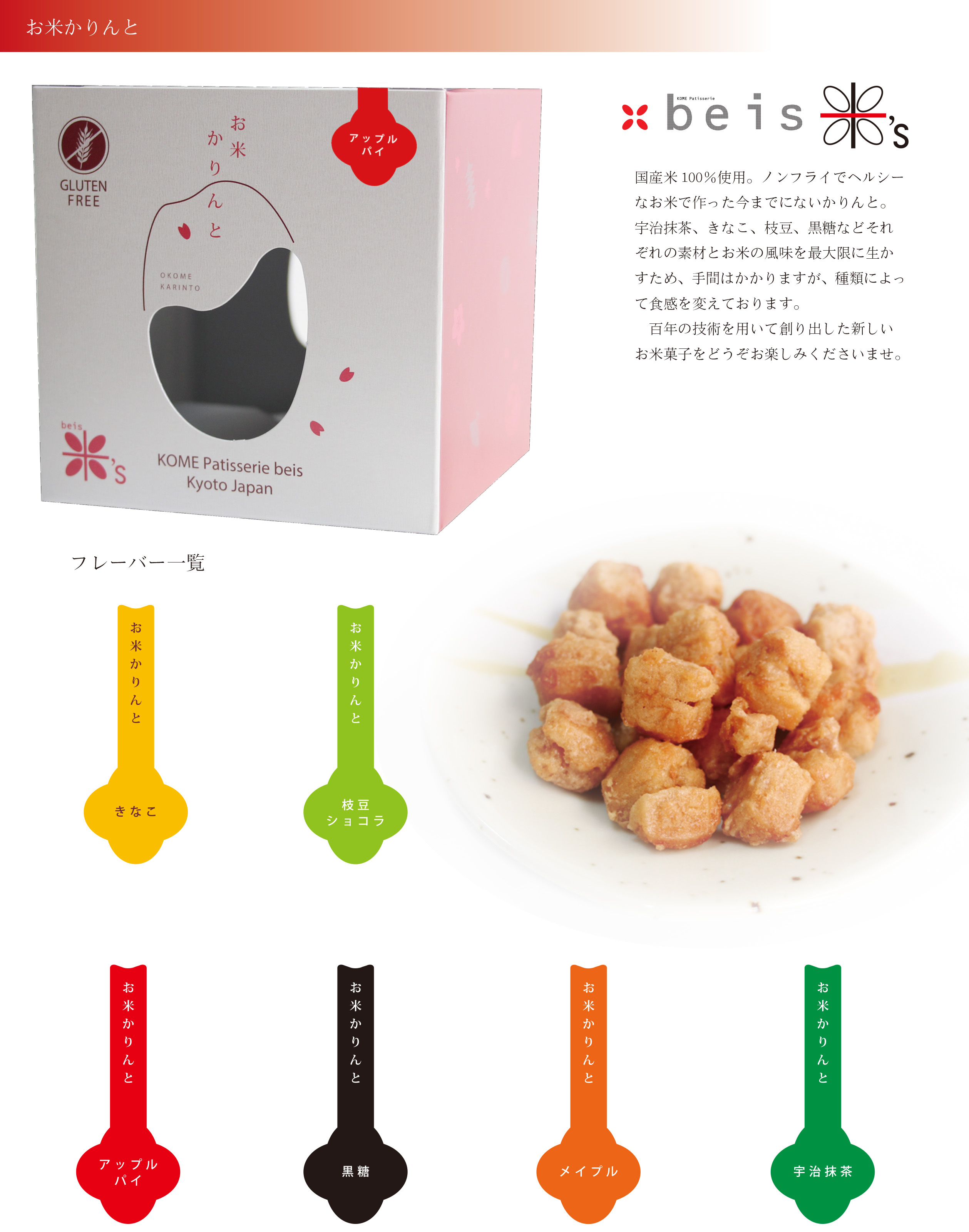 さらに、この京都初のセレクトショップで一番目を惹くのが、新商品「串わらび」・「京まある」とグルテンフリーにこだわった京都お米菓子専門店「KOME Patisserie 米’s(beis/ベイズ)」の新商品の数々だ。