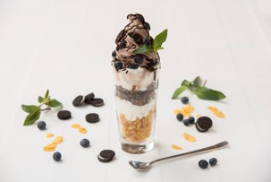 マックスブレナーで人気のソフトクリームがサンデースタイルになって登場。たっぷりのチョコがけコーンフレークとホイップクリームの上にオリジナルのチョコレートソフトクリームをのせました。仕上げにブルーベリーとオレオをトッピングしたボリューム満点のチョコレートサンデー。