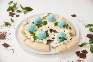 ピザ生地に、ミントパウダーを合わせたホワイトチョコレートとミルクチョコレート、マシュマロをのせて焼き上げ、仕上げにチョコミントアイスとミントをトッピングしました。濃厚なチョコレートと爽やかなミントの相性は抜群です。
