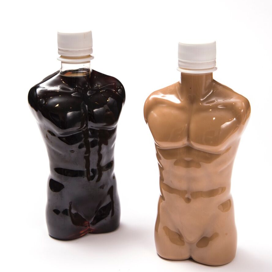 マッチョボトルに入ったドリンク。写真左から「ブラックマッチョドリンク」、「アイスロイヤルマッチョミルクティー」。