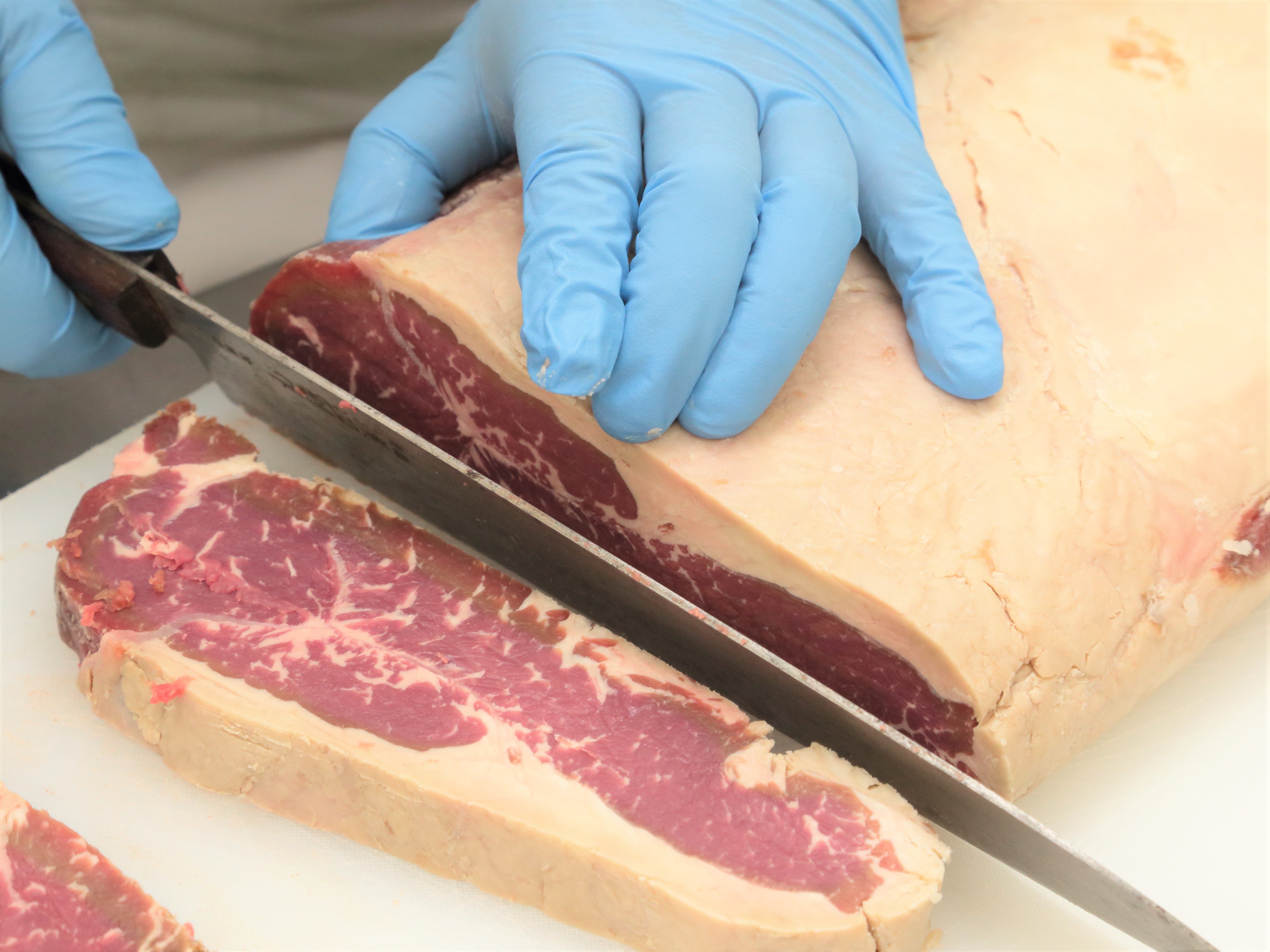20日以上冷蔵保管された牛肉の中から厳選した、おいしい牛肉ブロックを平均温度0℃・湿度99%の均一な同一条件下で240時間以上オープン予冷の管理保管(零度熟成)した牛肉を当社独自の熟成牛肉として調理します。