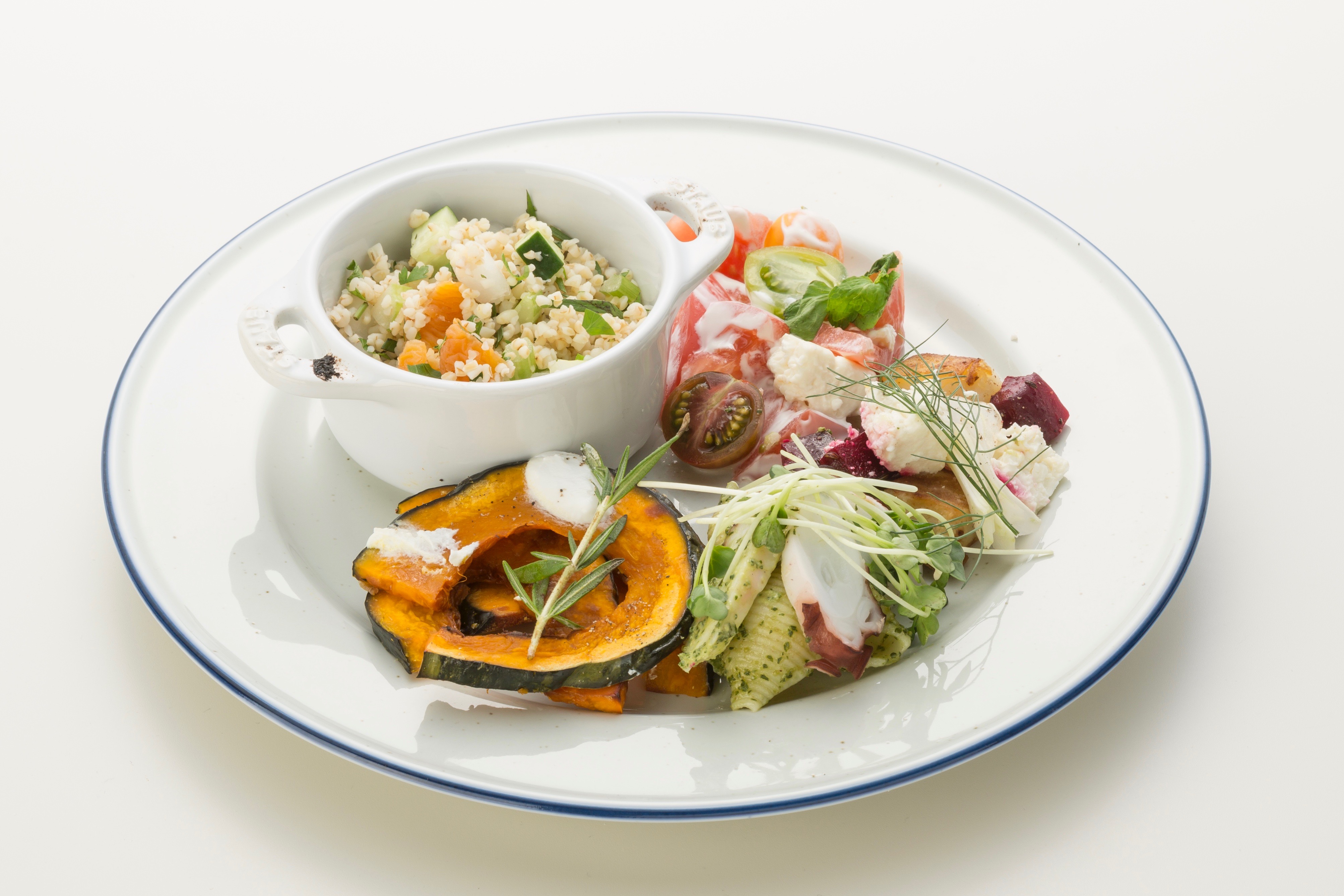スーパーフードやフレッシュハーブ、野菜を組み合わせたオリジナルのデリカテッセンをたっぷり