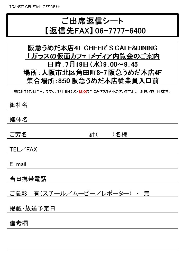 2017年7月19日(水)から2017年8月29日(火)までの期間、阪急うめだ本店4F『CHEER’S CAFE&DINING』にて、累計発行部数5,000万部を突破した大ベストセラー少女漫画『ガラスの仮面』のコラボカフェ『ガラスの仮面カフェ』を期間限定でオープンいたします。『ガラスの仮面』のコラボカフェは、作者・美内すずえ氏の出身地である大阪では初の開催となります。