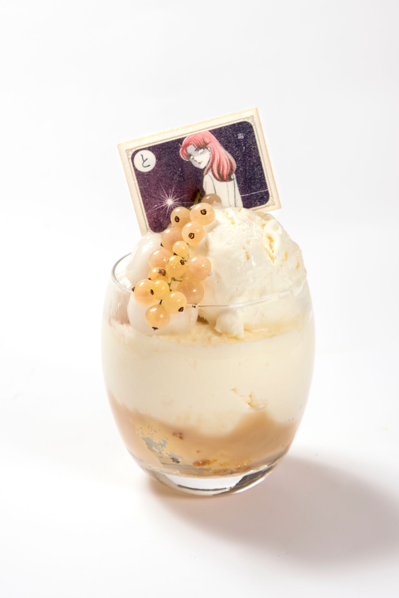 原作者・美内すずえ先生一押しメニュー。バニラアイスや白あん、マスカルポーネクリームに白すぐりを使った真っ白のパフェ。美味しさにゆえに、あなたも白目に。