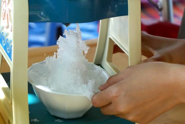 氷柱を設置する際には、職人が氷柱を切り出す「氷解体ショー」を行い、かき氷としてお召し上がりいただきます。