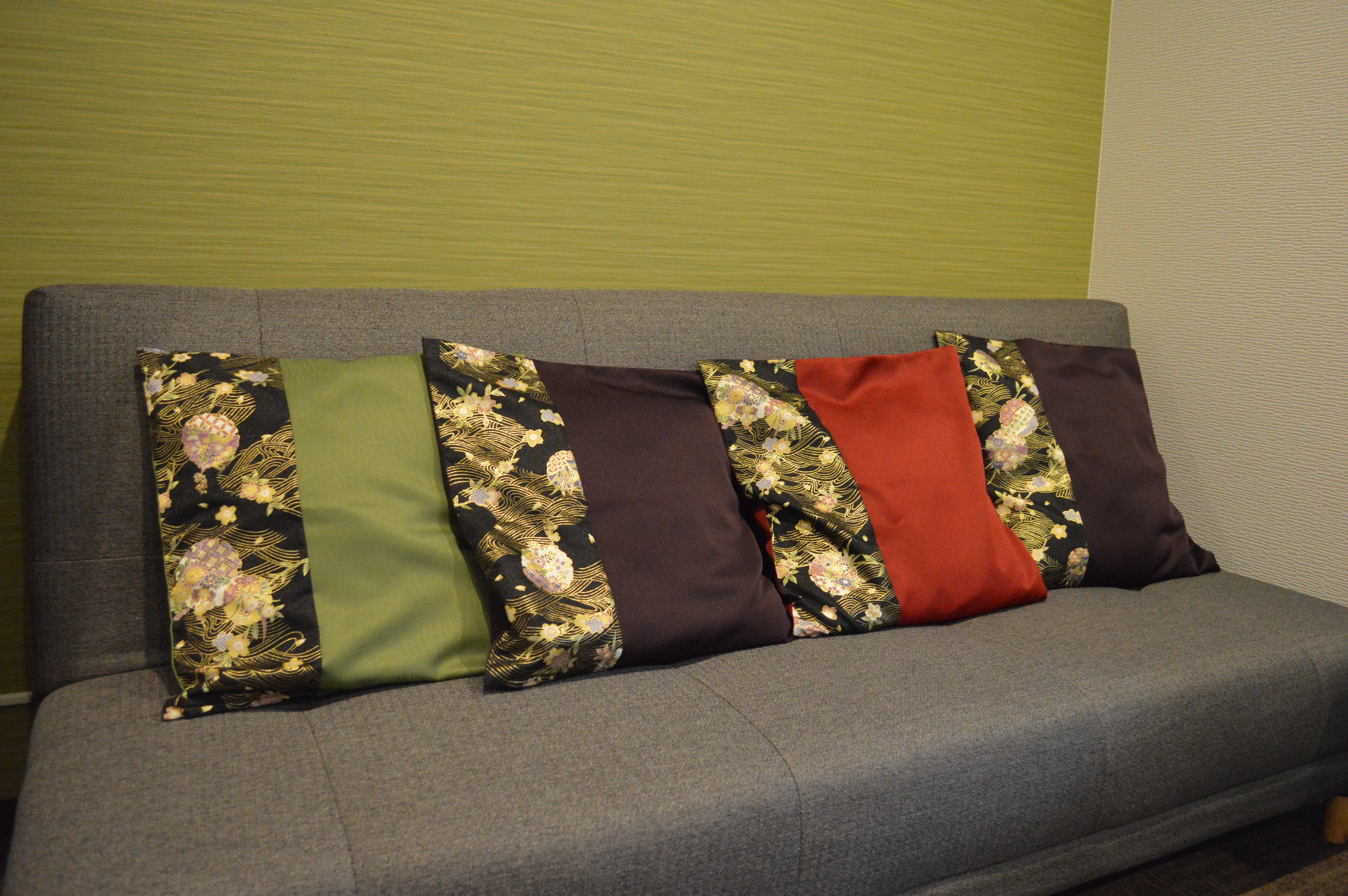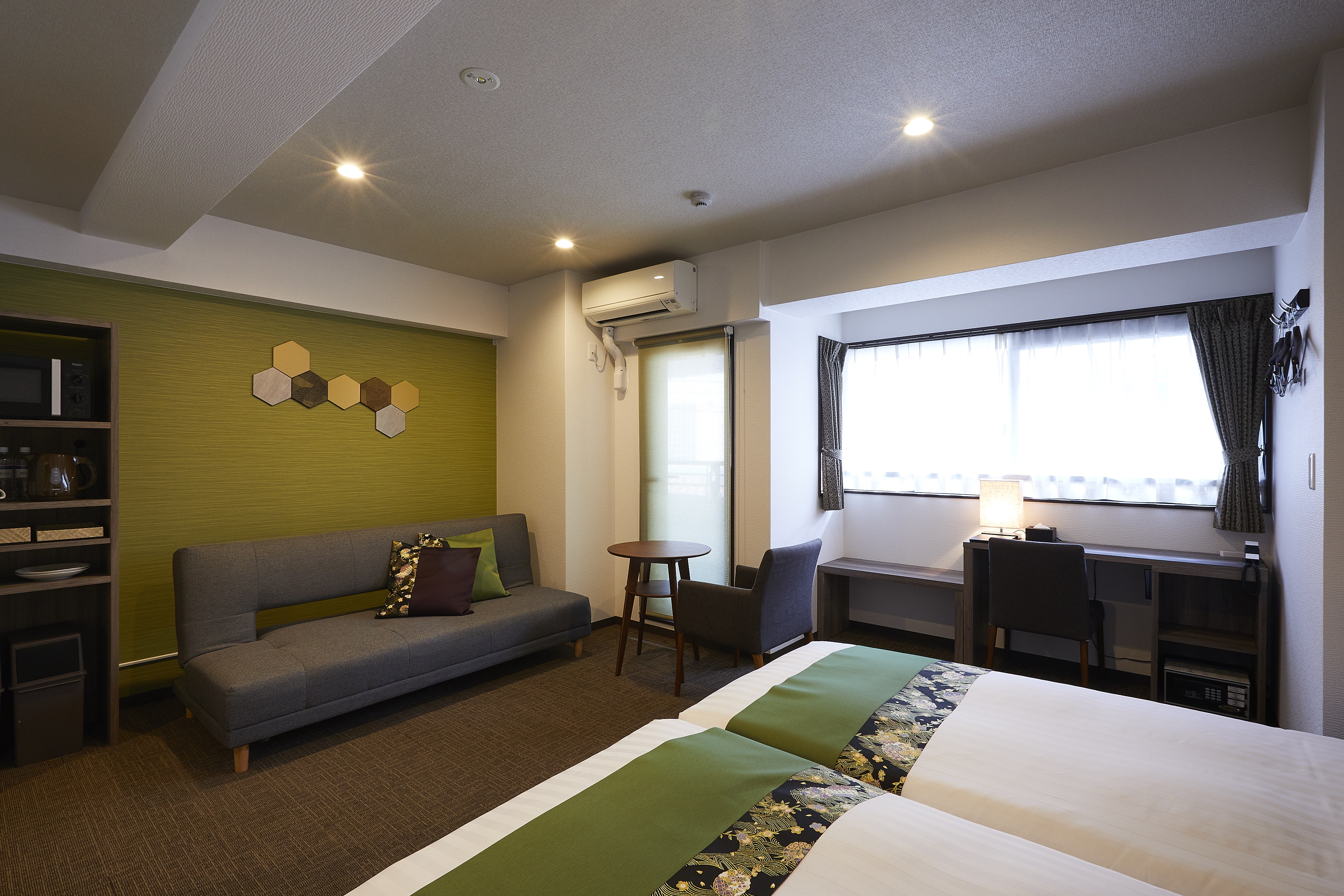 デザインコンセプトは、「シックモダン+和(京)のエッセンスの融合」。客室は、京都の和をイメージした抹茶色、小豆色、藍色の3パターンをご用意し、和モダンな空間を演出。京都の素材メーカーによる和紙、着物生地を使用した装飾品やファブリックを設置するほか、ベッドはフランスベッドを使い、地元京都西川の質の高い寝具をしつらえました。また、京にまつわる情報発信とゲスト同士の交流の場になればと思い、1階には談話室を設置します。