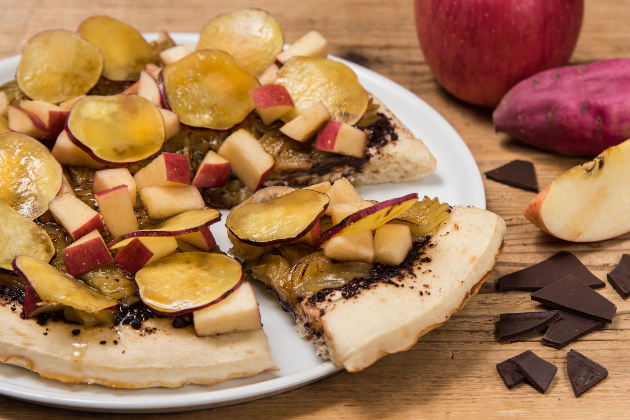 ピザ生地に、ダークチョコレートとスイートポテトペースト、クリームチーズをのせて焼き上げ、仕上げにフレッシュなリンゴとサツマイモをトッピングしました。たっぷりの秋の味覚と、ほんのりビターなチョコレートの相性は抜群です。