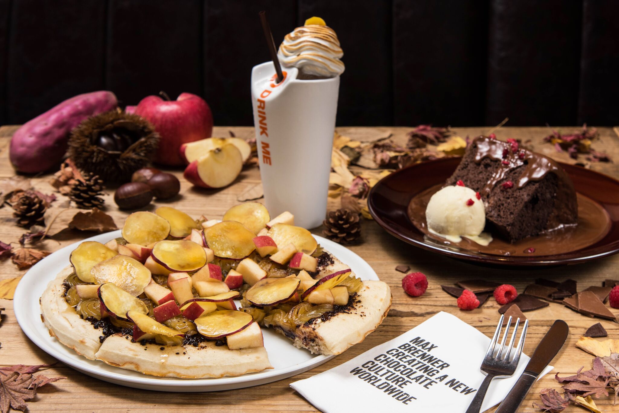 2017年9月1日(金)から11月30日(木)までの期間、MAX BRENNER CHOCOLATE BARでは、秋限定メニューとして『スイートポテトアップルピザ』、『ブラックアウトケーキ』、『スモア モンブランラテ チョコテール』の3種が登場いたします。また、9月16日(土)から10月31日(火)までの期間、ハロウィンメニューとして『パンプキンモンスターフォンデュ』を販売いたします。