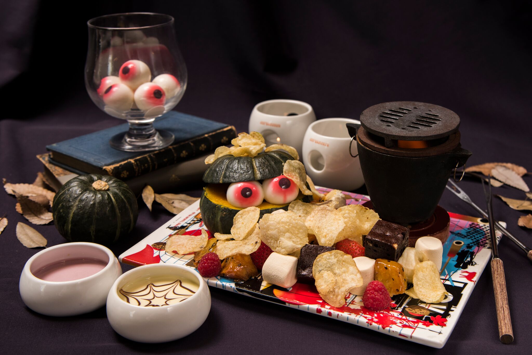 イチゴ、バナナ、ブラウニー、スイートポテト、コーヒーマシュマロ、チップスの中に、赤い目玉のパンプキンモンスターが隠れています。蜘蛛の巣デザインのホワイトフォンデュと、紫芋のチョコフォンデュにディップしてお召し上がりください。