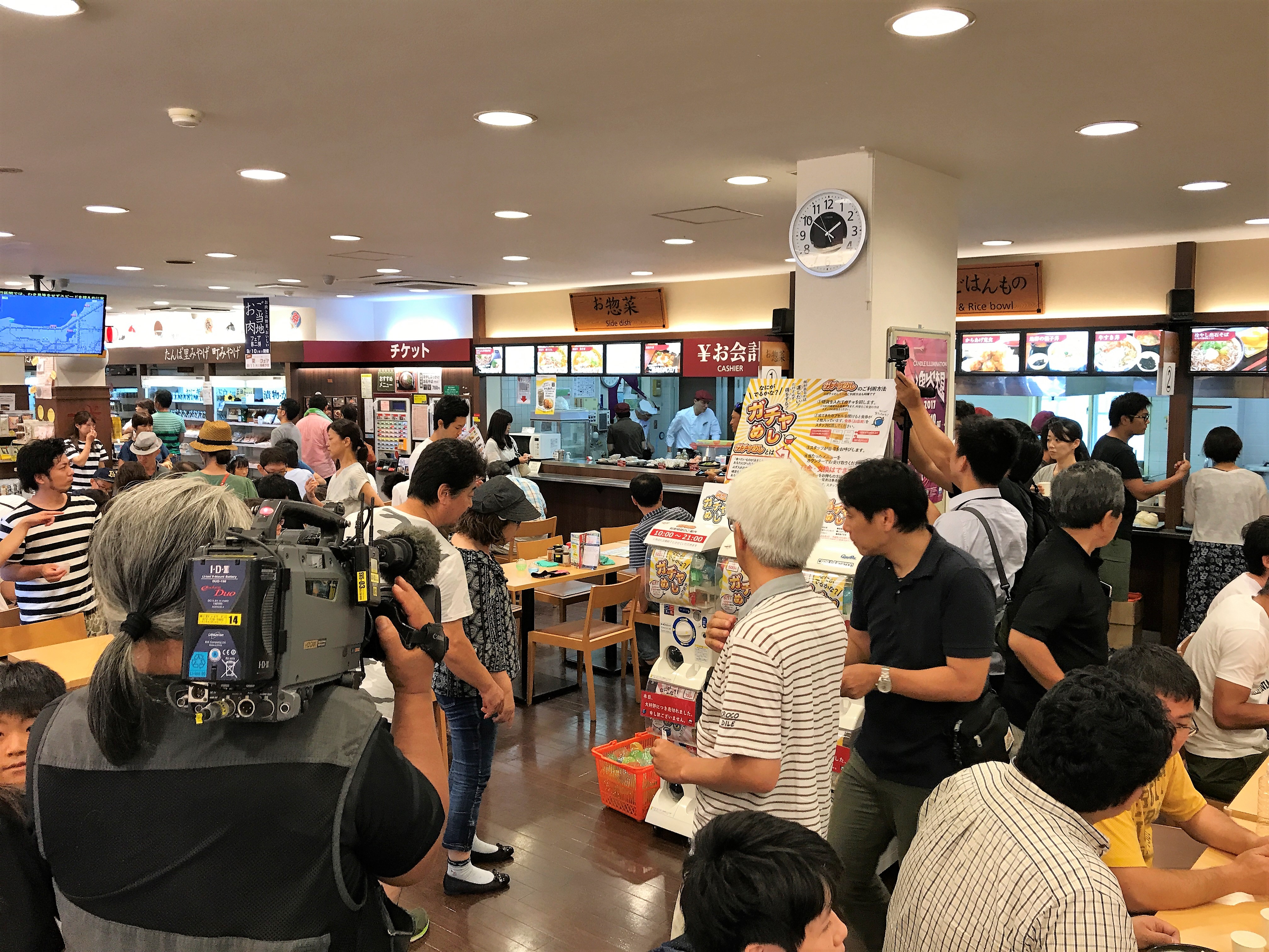 ガチャガチャを回して、カプセルの中の食券で食べる料理が決まる「ガチャめし」が、当初予定どおり8/31でサービスを終了します。期間中は帰省途中のご家族からカップル、遠方からお越しの方までたいへんなご好評をいただき、お盆期間中の来場者数は2000人以上、出たカプセルの数は累計で2万個を超えました。