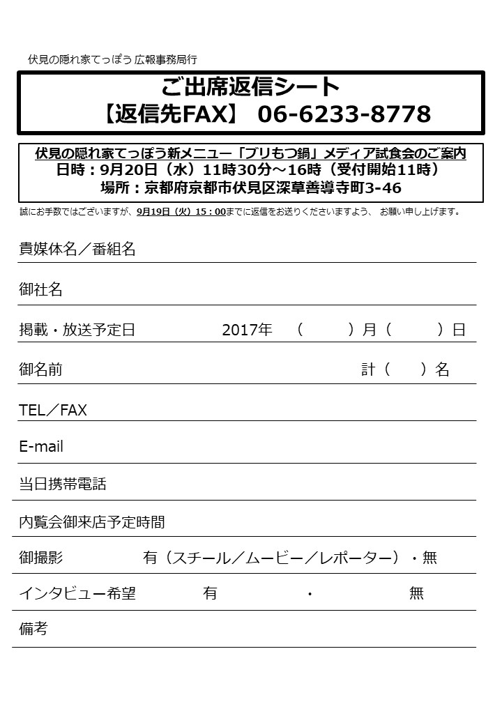 ※ご参加いただけるメディア様は、お手数ですが下記のご出席シートをFAXにてお送りください。
