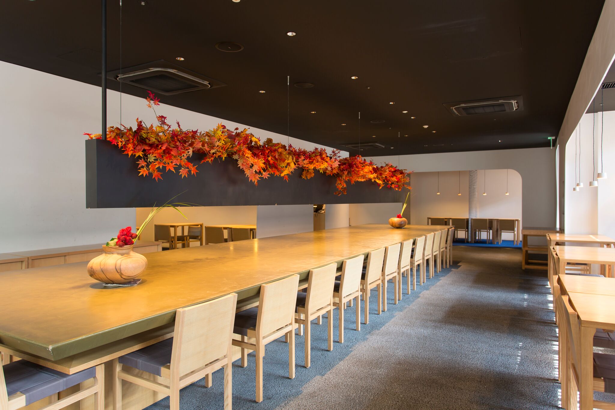 また、毎年好評を頂いている店内の紅葉装花が今年も登場!5mのロングテーブル上に、一部本物も使用した60本以上の紅葉で店内を彩ります。段々と秋めく京の街並みよりひと足先に、「居様/IZAMA」で秋をお楽しみください。