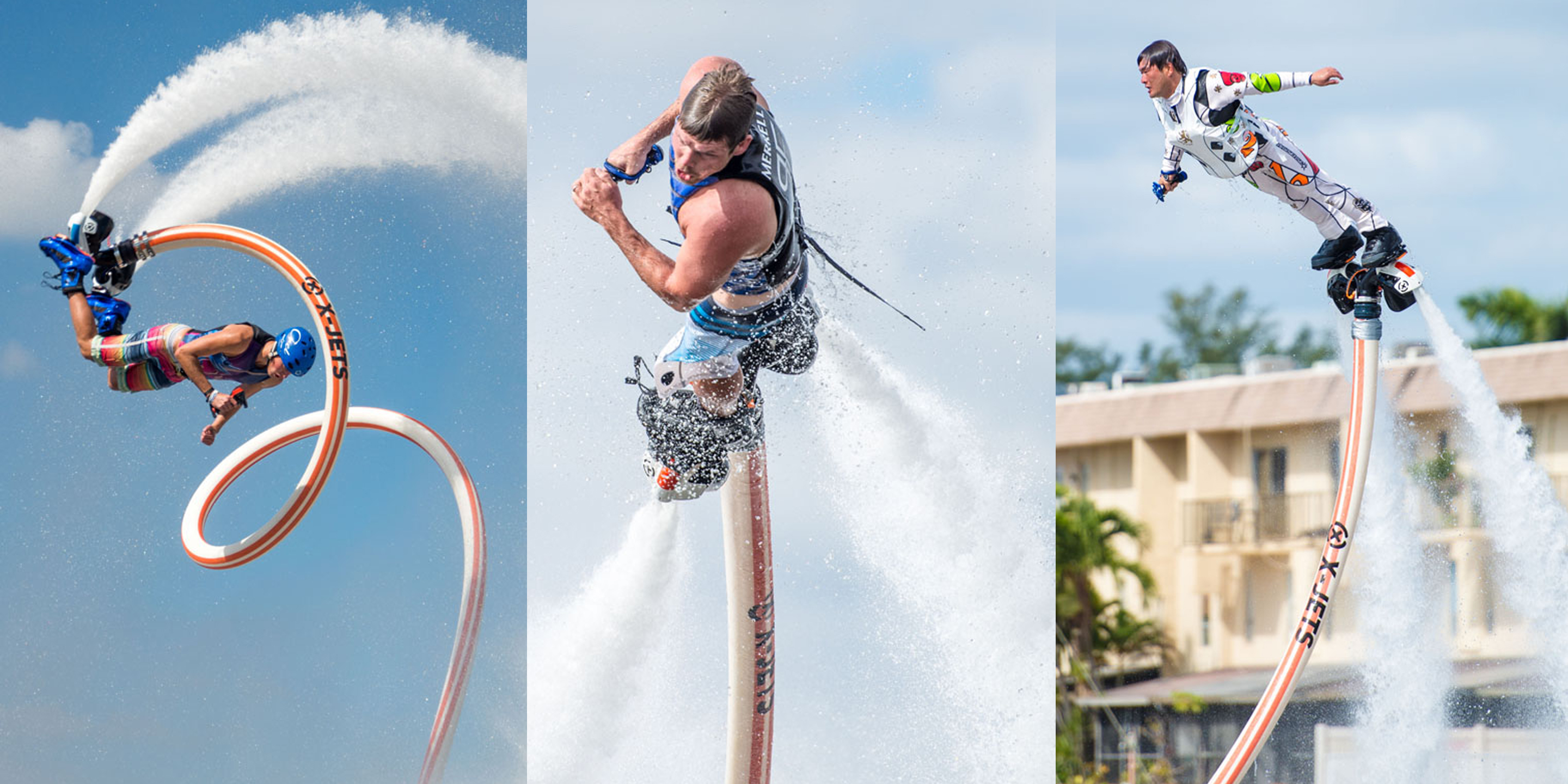 ジェットブレードは水上バイクから出る水流をホースを通して、足につけた特殊な装置から勢い良く吹き出し、その水流で宙を舞います。