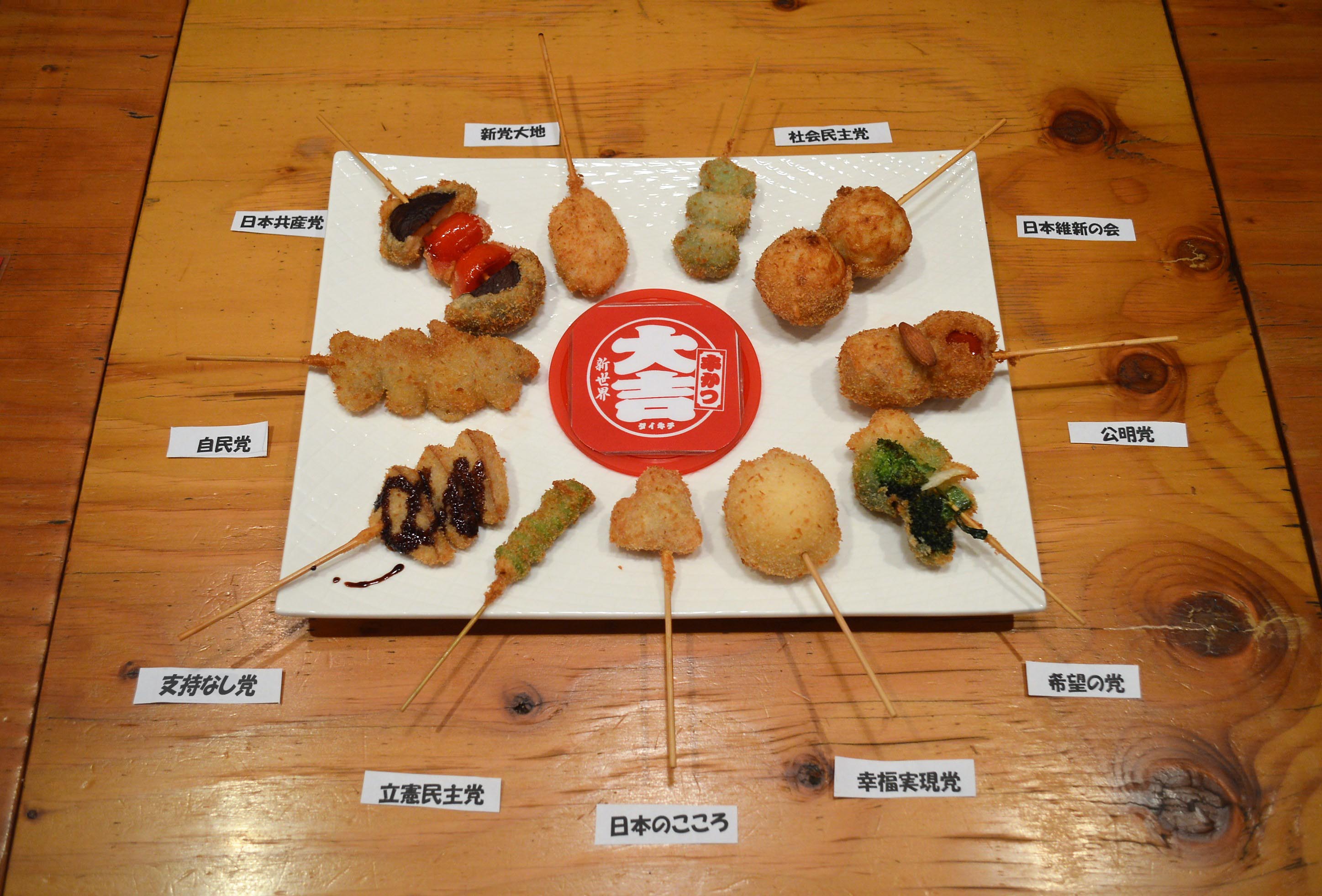 大阪・新世界の「串カツ大吉 新世界店」(大阪府大阪市浪速区恵美須東2-5-9)で、衆議院選挙を盛り上げる応援メニュー「選挙串」(税込1,094円)を販売いたします。各党のイメージカラーや党首の名前をもじった食材を使った串カツです。