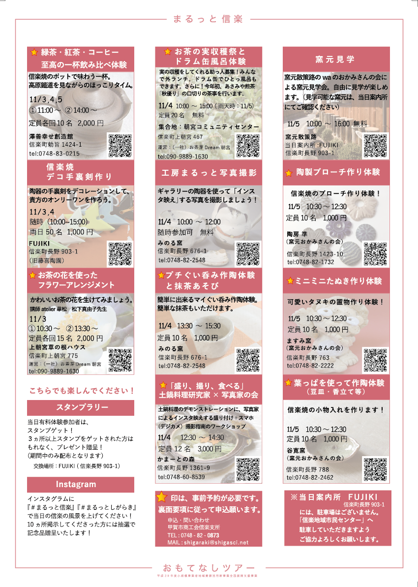 甲賀市の伝統的地場産業であり、地域の資源である信楽焼と朝宮茶を用いた、「おもてなし」をテーマにした11種類の体験型イベントを各事業所が実施します。いろいろ選んで楽しんで、甲賀市信楽を「まるっと」楽しんでください。