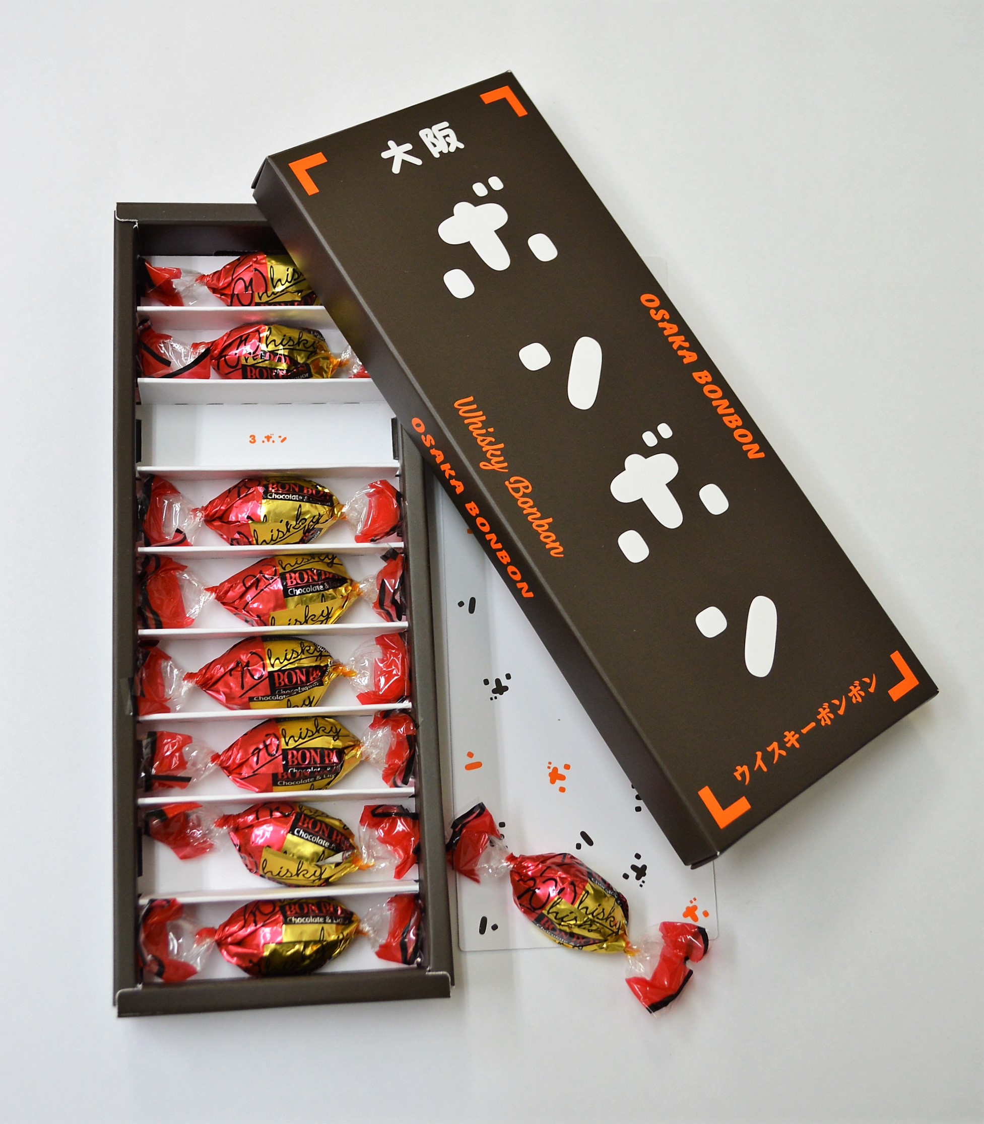 ウイスキーボンボンは、ウイスキーをシャリシャリ食感の砂糖の殻で包み、それをチョコレートでコーティングしたお菓子です。今回発売する新商品「大阪ボンボン」は、国内唯一のウイスキーボンボン専業メーカーとして国内シェア率70%を占める「丸赤製菓糸田川商店」とコラボレーションし、約1年間の開発期間を経て完成しました。