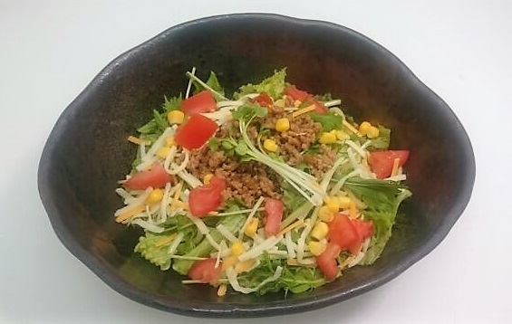 野菜いっぱい、タコライス風のミンチをトッピングしたベジそば。