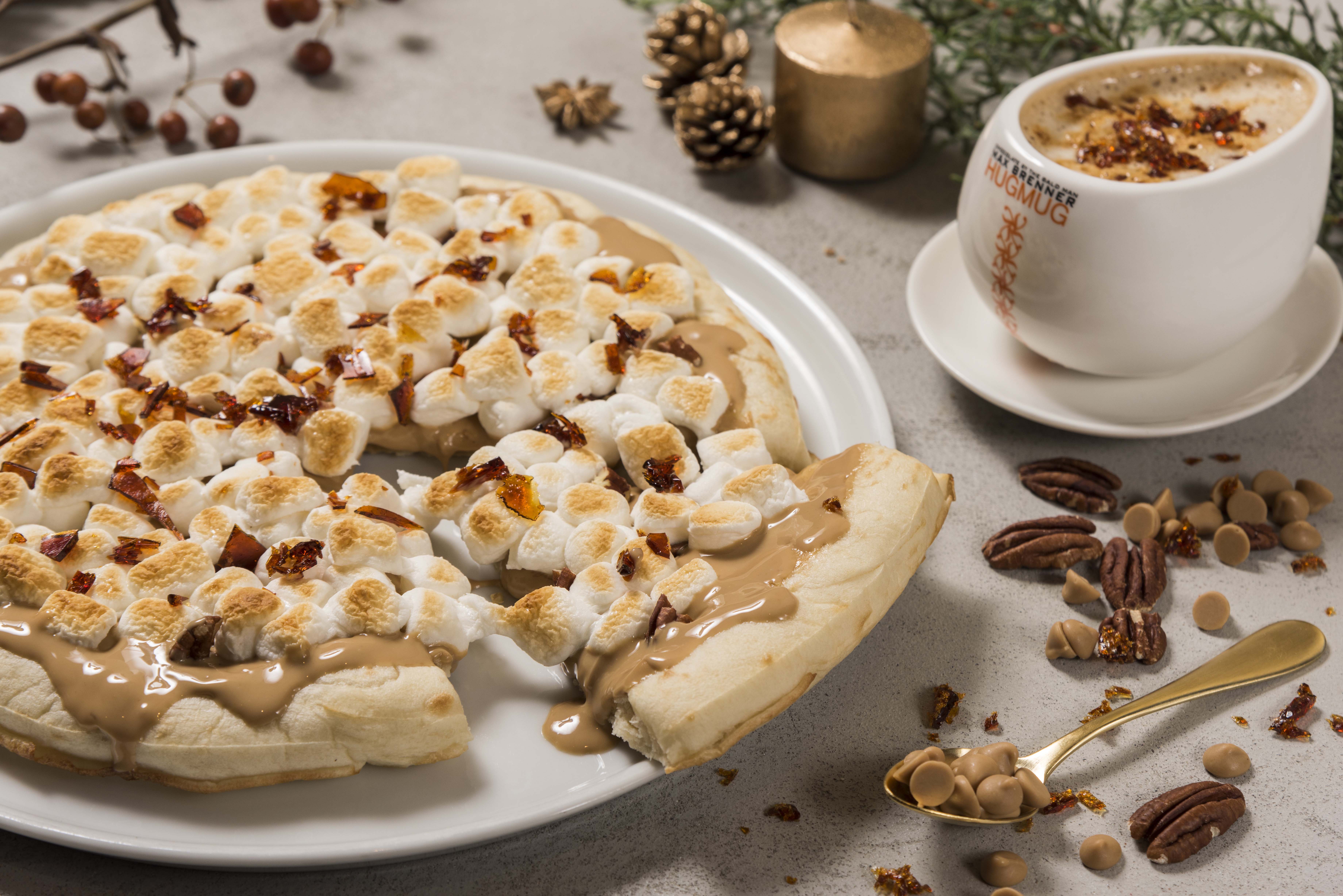 クリスマス限定の『キャラメルゴールド チョコレートチャンクピザ』はキャラメルトフィーのような風味のゴールドチョコレートをたっぷり使ったピザに、キラキラと輝くローストキャラメルチップやピーカンナッツを散りばめました。今までにない濃厚なキャラメル風味のチョコレートピザをお楽しみください。また、『キャラメルゴールド ホットチョコレート』はチョコレート本来の上品な甘さを生かしたキャラメル風味のホットチョコレート。トッピングのキャラメルチップの食感がアクセントになった贅沢な味わいの一杯です。
