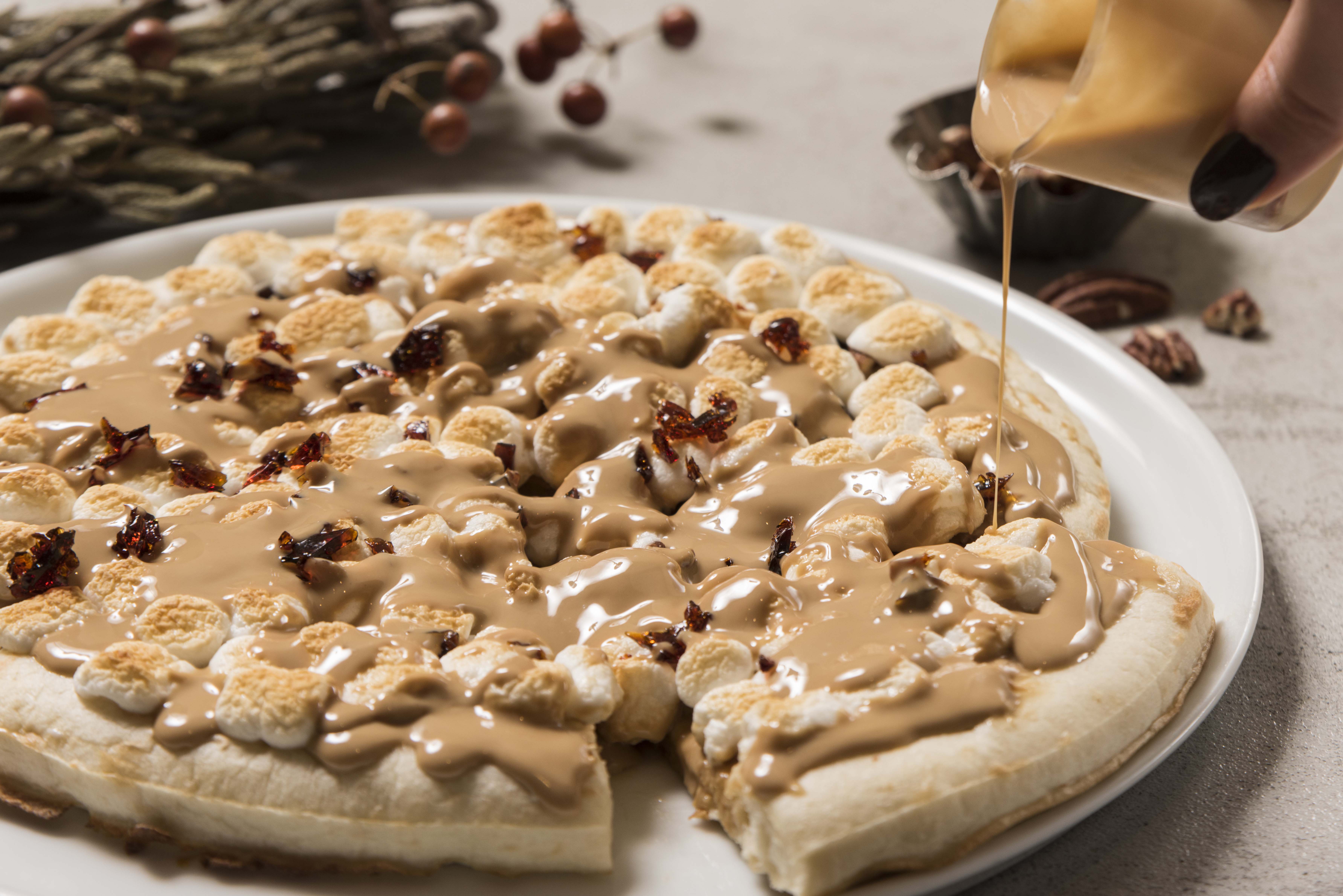 キャラメルトフィーのような風味のゴールドチョコレートをたっぷり使ったピザに、キラキラと輝くローストキャラメルチョコチップやピーカンナッツを散りばめました。今までにない濃厚なキャラメル風味のチョコレートピザをお楽しみください。