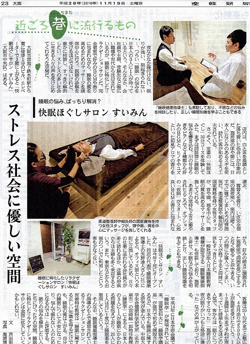 「快眠ほぐしサロンすいみん」は株式会社ほぐれて屋(本社:大阪市中央区、代表:矢野達人)が2016年7月1日にOPENした、睡眠に特化した新しいリラクゼーションサロンです。