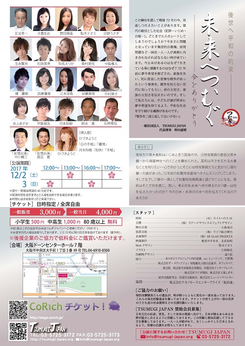 一般社団法人TSUMUGI JAPAN主催『未来へつむぐ~今をありがとう~』を12月2・3日大阪ドーンセンターホールにて上演いたします。