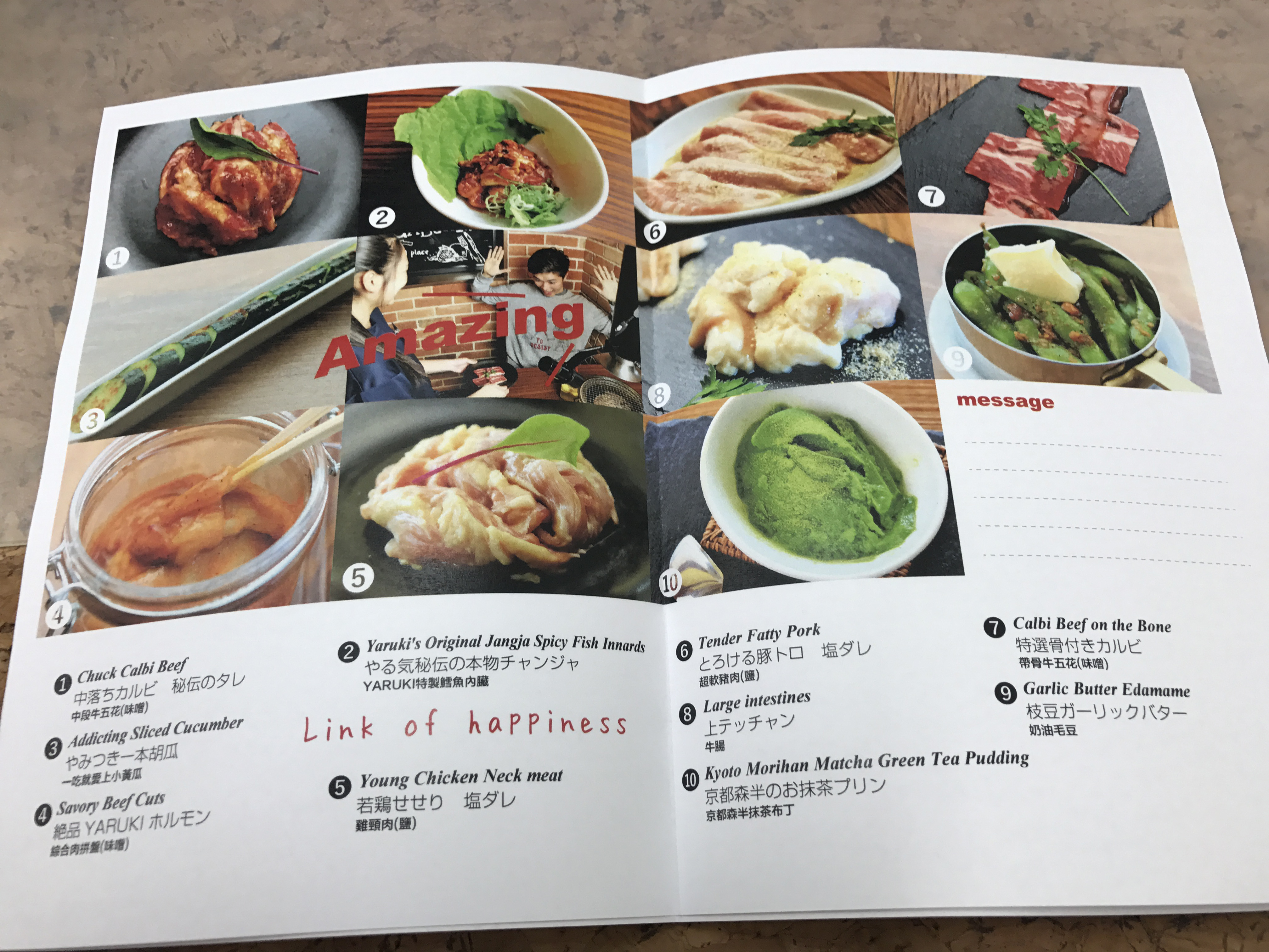 1.中落ちカルビ秘伝のタレ 2.骨付きカルビ秘伝のタレ 3.上テッチャン塩 4.絶品YARUKIホルモン 5.若鶏せせり塩ダレ 6.とろける豚トロ塩ダレ 7.やる気の本物チャンジ 8.やみつき一本胡瓜 9.枝豆ガーリックバター 10.京都森半のお抹茶プリン